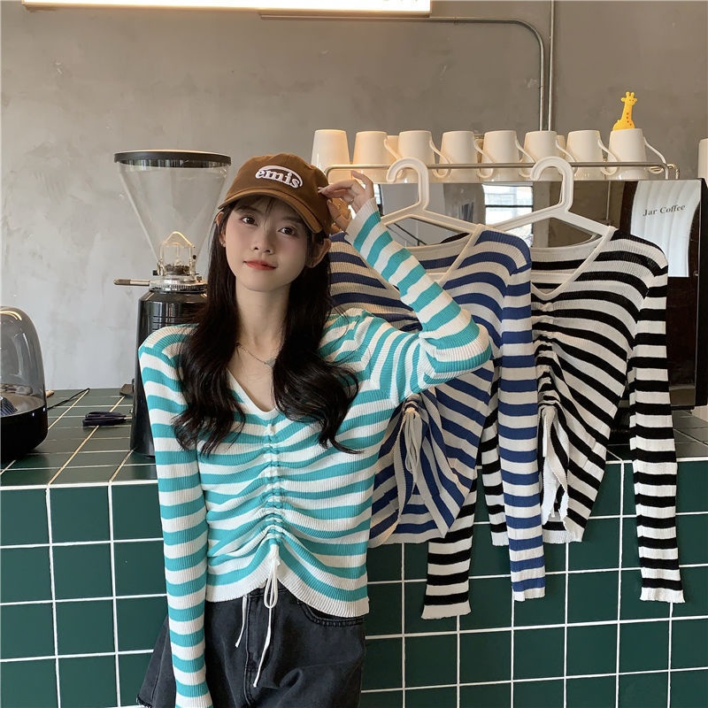 秋冬季新款韩版V领防晒衣抽绳长袖气质条纹防晒衫针织衫上衣女潮