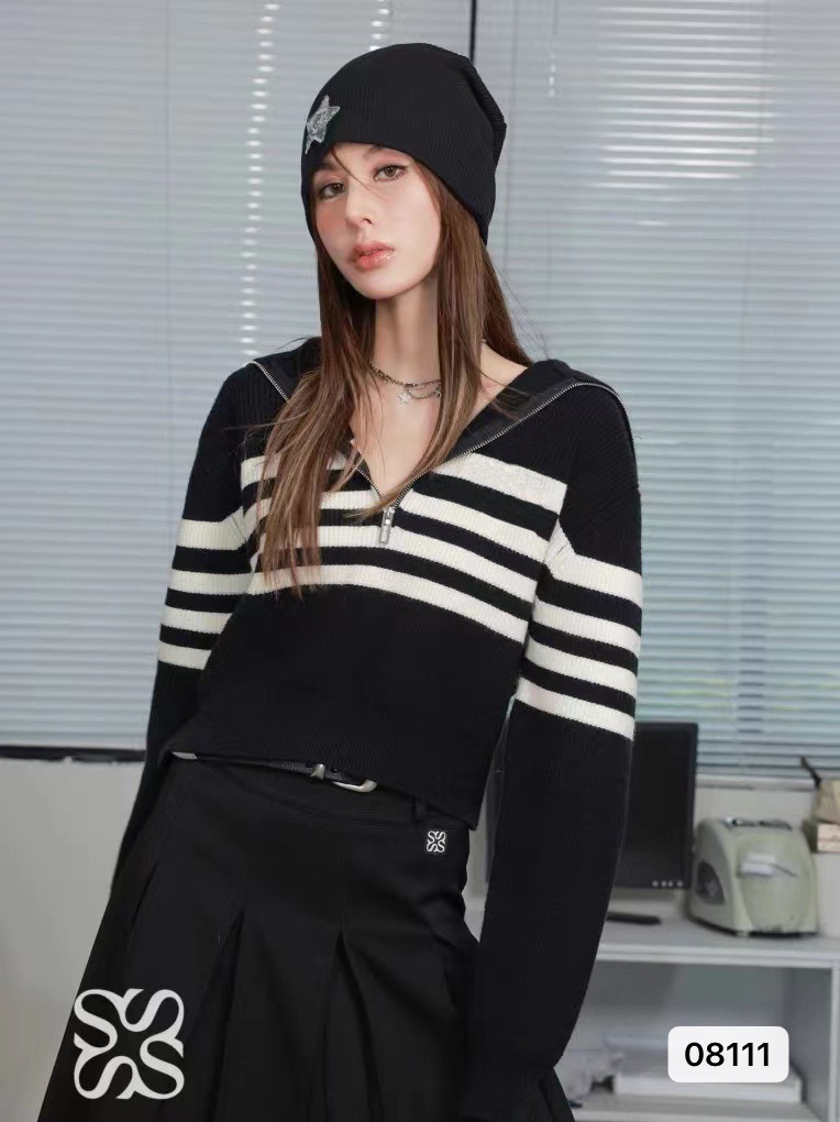 小众拉链条纹针织衫女秋冬季新款设计感翻领别致毛衣打底衫上衣潮