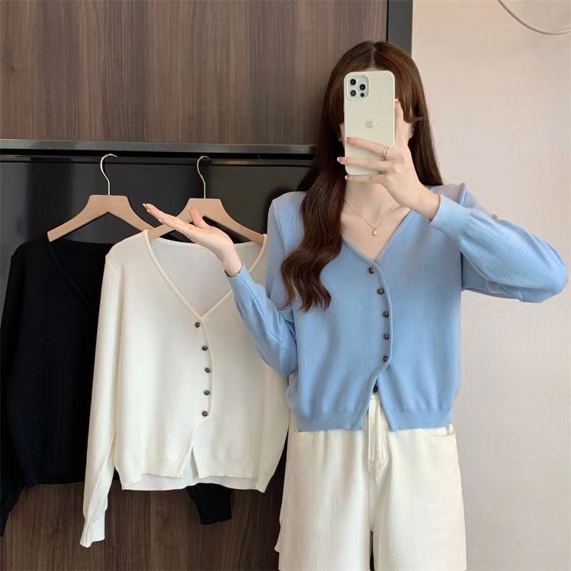 2023秋季不规则V领针织开衫女早秋季慵懒复古设计感小众短款外套