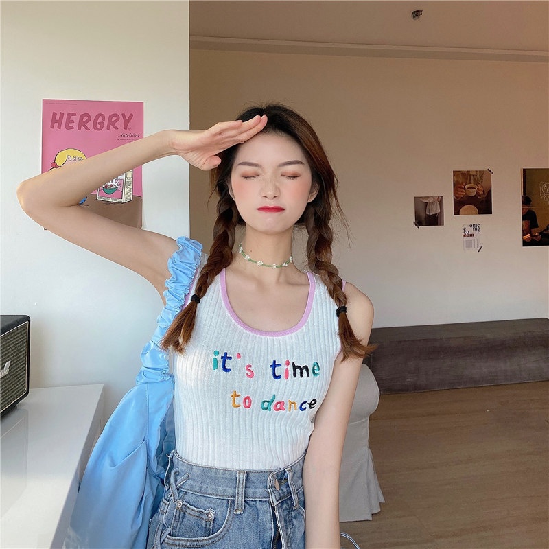 泫雅风时尚撞色可爱甜美立体字母刺绣bm吊带短款针织背心女内搭潮