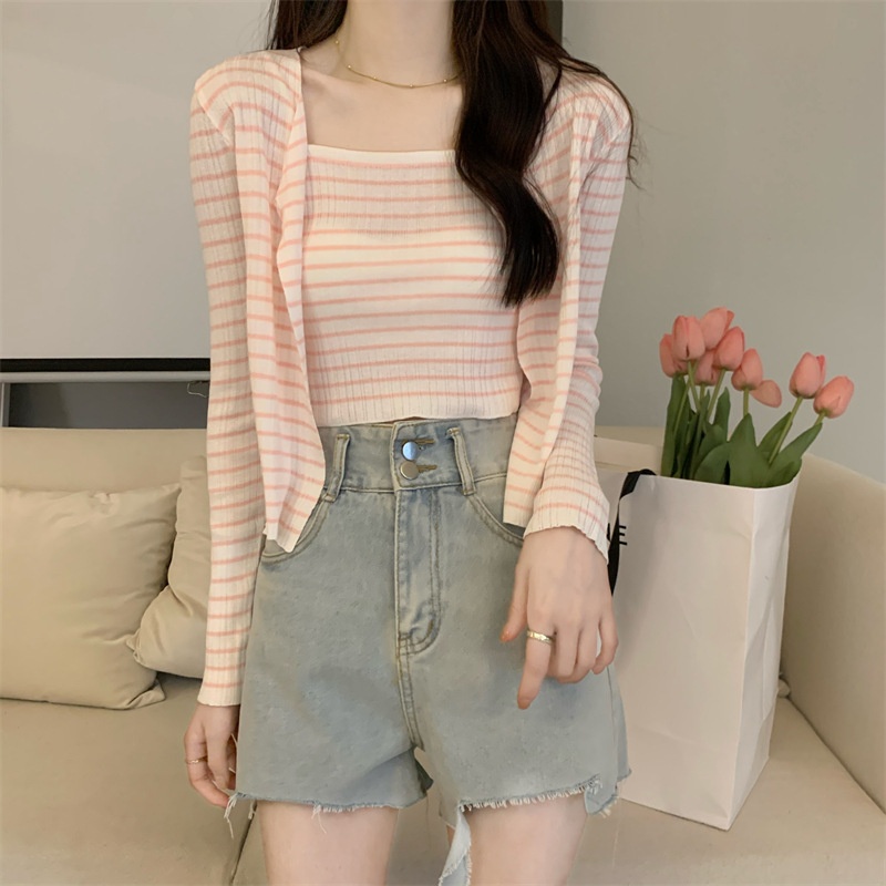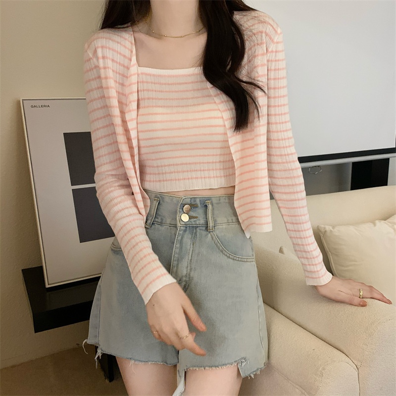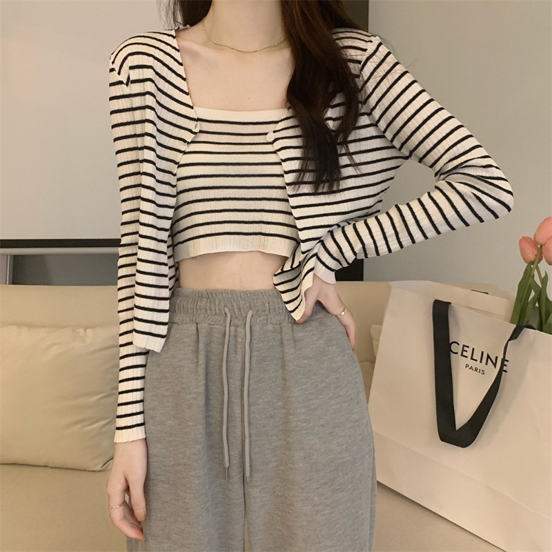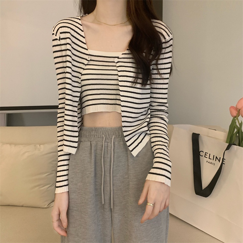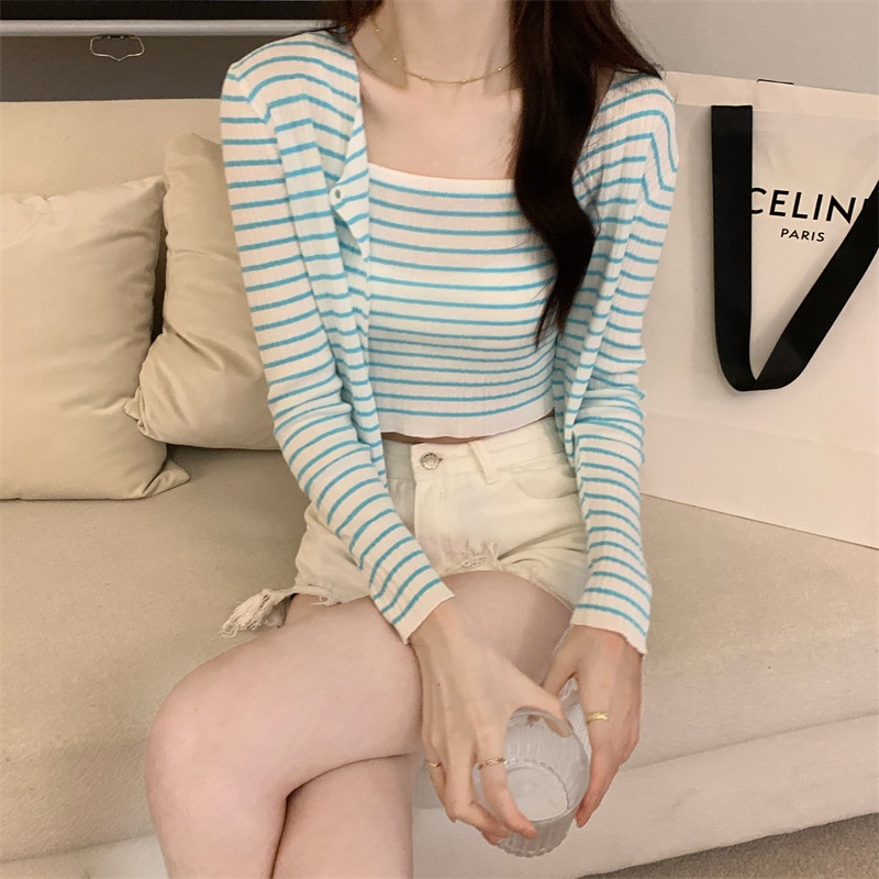秋季短款冰丝薄款防晒外套女条纹针织开衫罩衫上衣+吊带背心套装