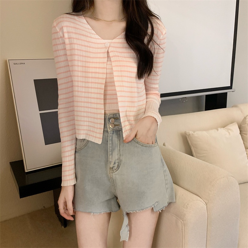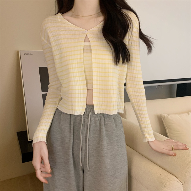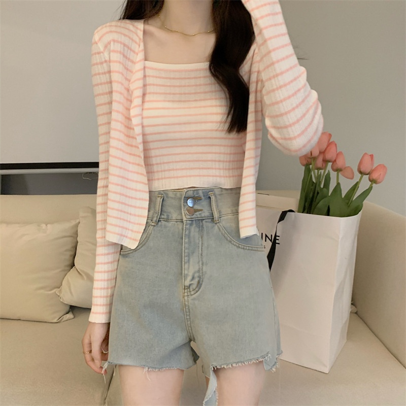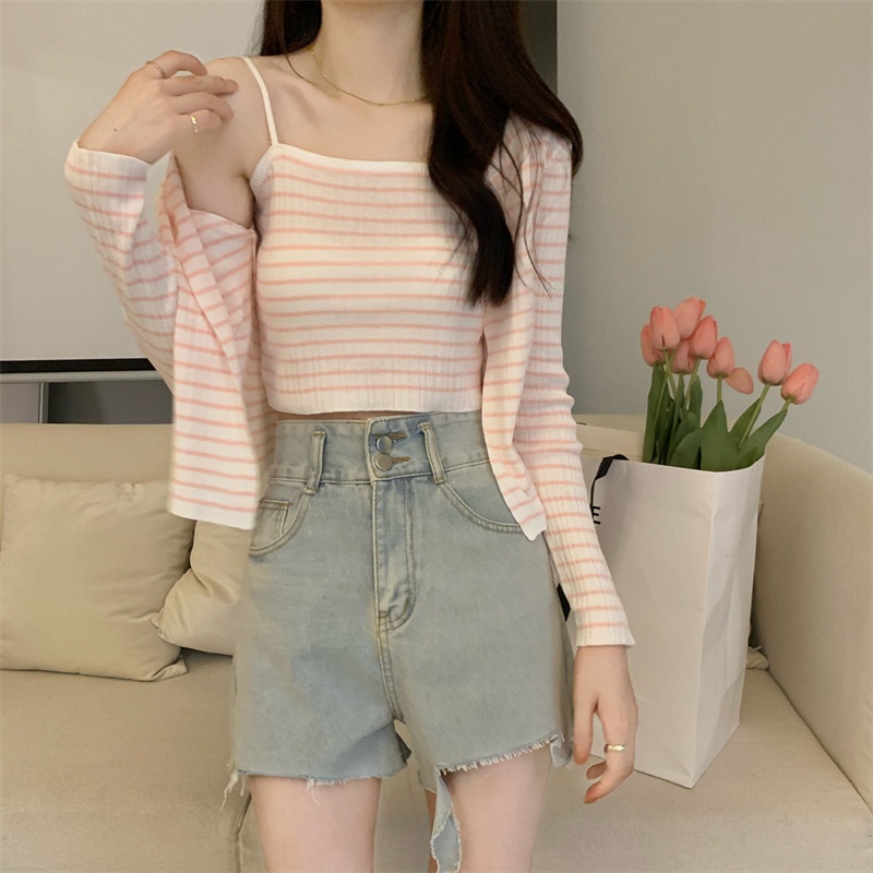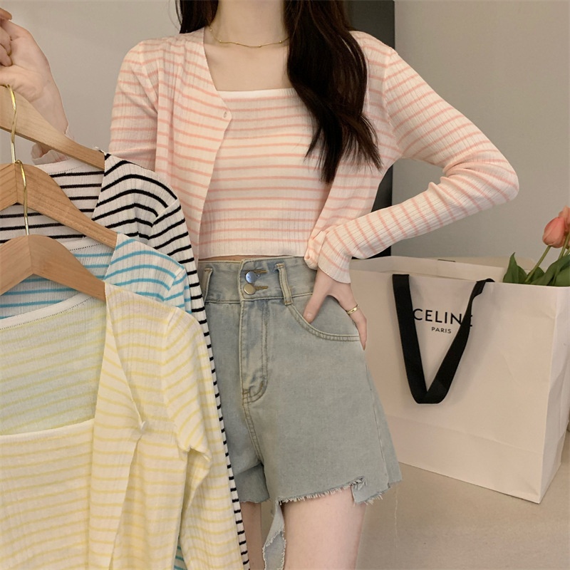 秋季短款冰丝薄款防晒外套女条纹针织开衫罩衫上衣+吊带背心套装