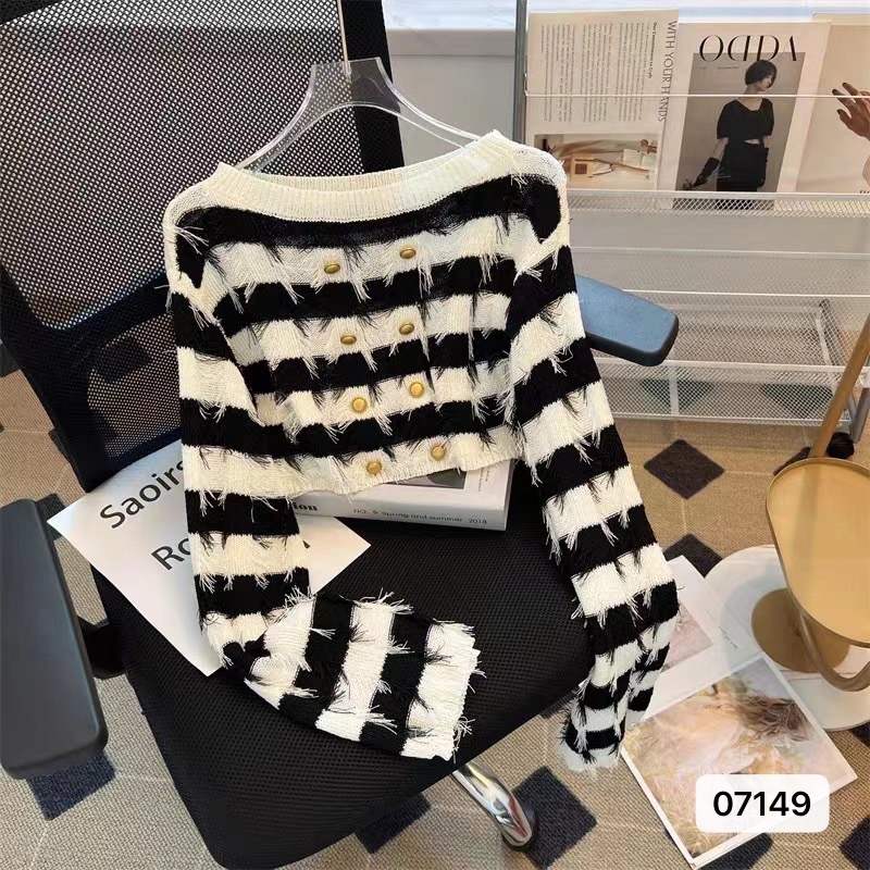 高级感条纹流苏针织衫女秋装设计感小香风显瘦一字肩短款毛衣上衣