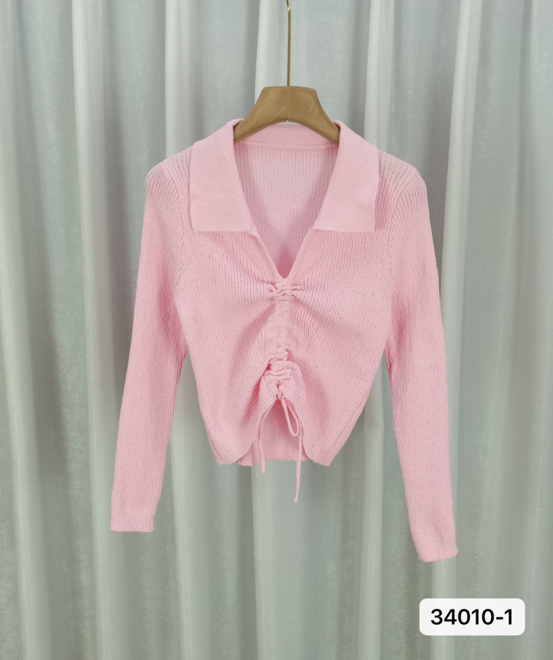 V领长袖针织打底衫女士 春秋季设计感修身抽绳褶皱洋气内搭上衣服