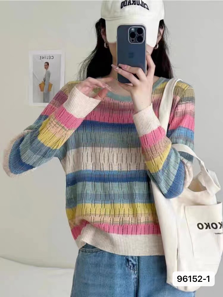 2023秋装新款圆领条纹长袖针织衫遮肉小众百搭甜美时尚别致上衣女