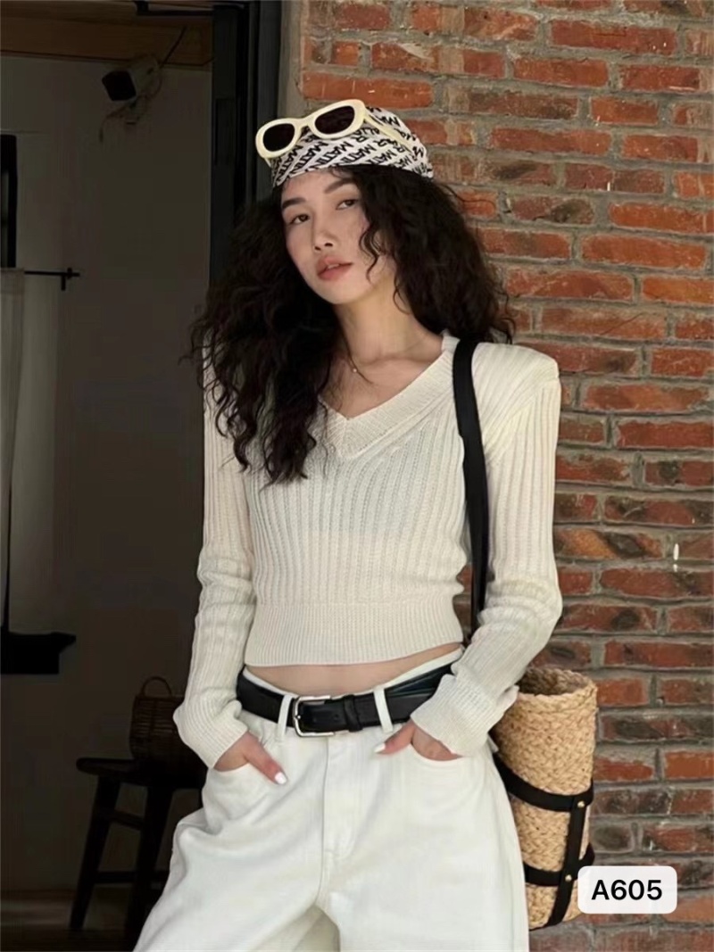 韩系V领长袖针织衫女 早秋新款设计感辣妹露背系带修身短款上衣潮