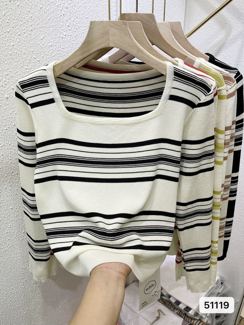 2023秋季新款撞色条纹长袖针织衫女方领纯欲风显瘦甜辣薄款上衣潮
