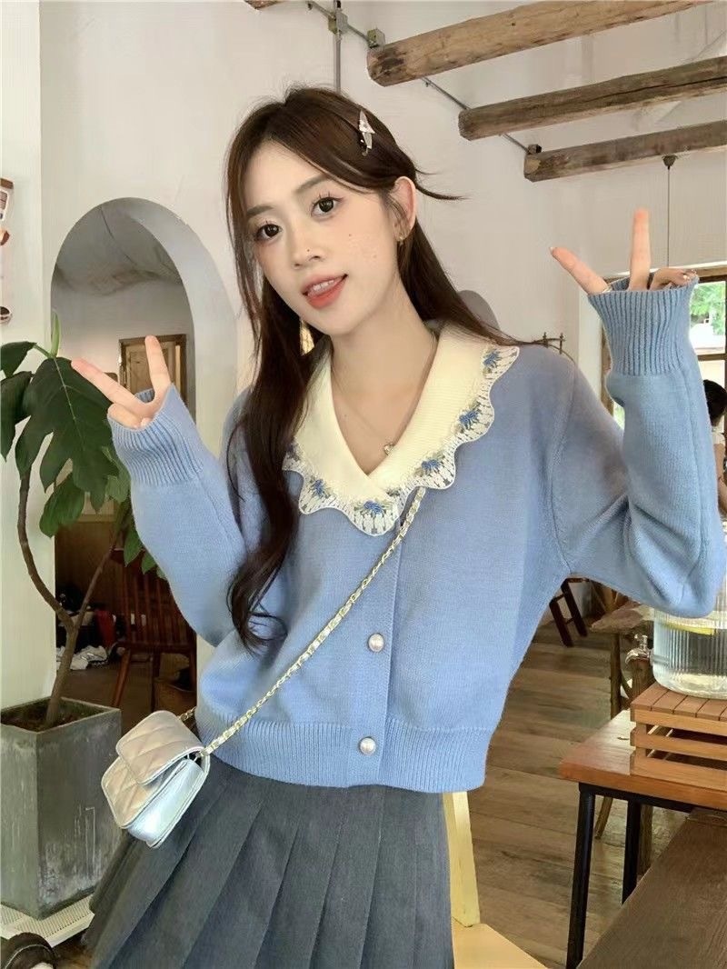 2023夏季新款蕾丝刺绣花边领重工针织开衫女精致珍珠扣甜美上衣潮