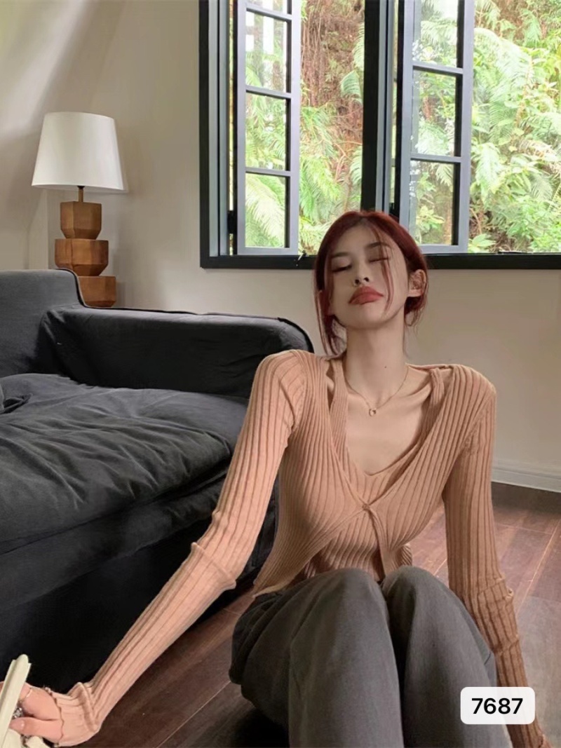 假两件挂脖v领长袖吊带针织衫女 秋季薄款设计感小众修身短款上衣