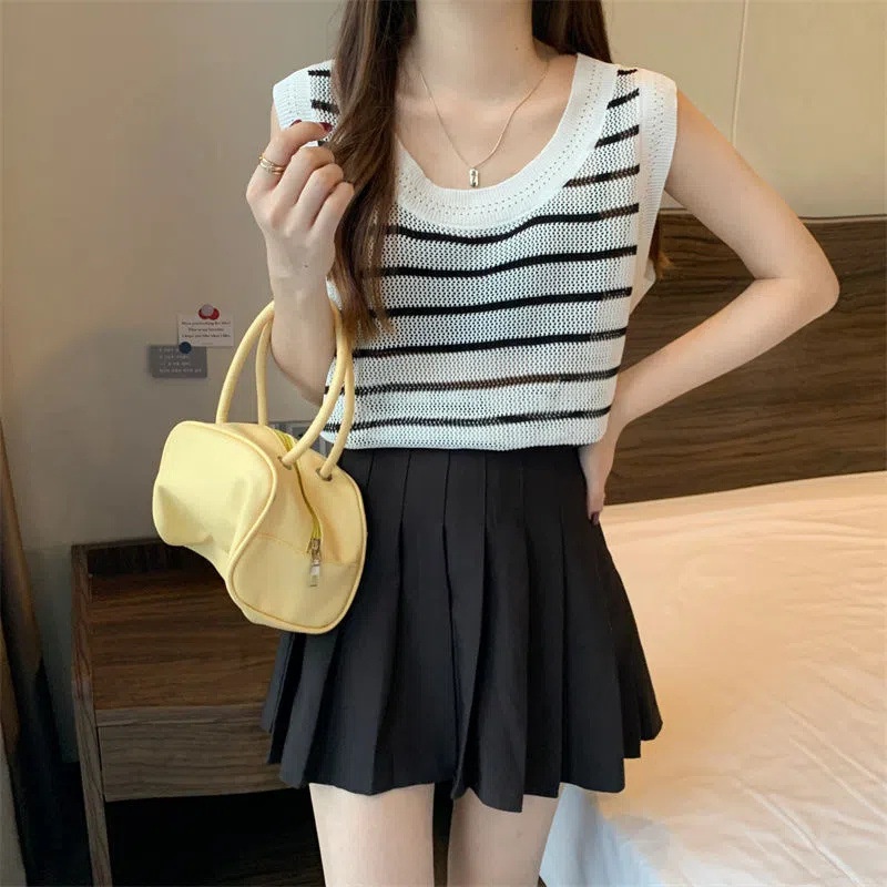 拼色条纹镂空针织背心女2022年夏季新款宽松内搭无袖辣妹短款上衣