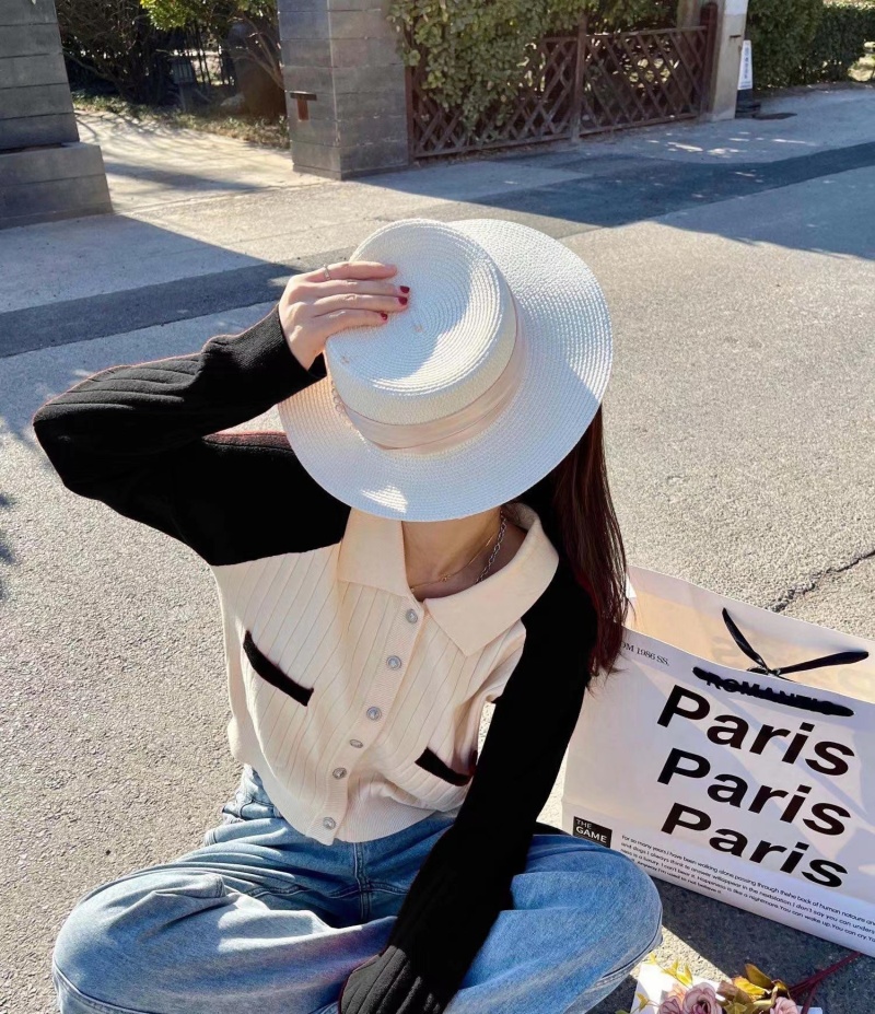 法式拼接翻领长袖针织开衫女2023新款早秋休闲宽松洋气短款上衣潮