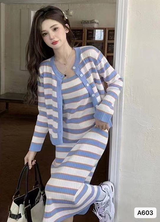 2023春秋季新款百搭时髦甜美清新长袖开衫 +条纹显瘦连衣裙套装女
