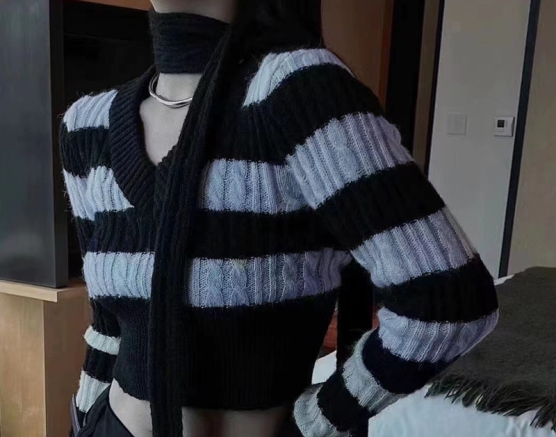 2023春秋新款性感辣妹V领麻花纹间色 修身显瘦百搭短款长袖上衣女