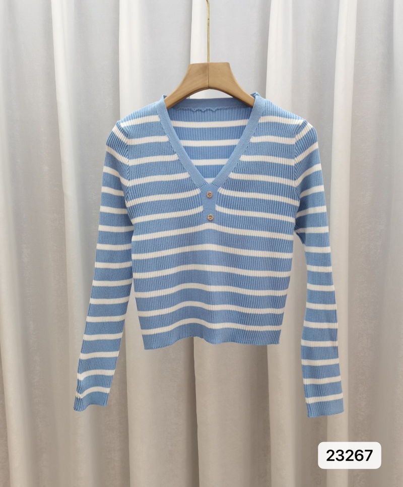 2023春秋新款条纹长袖t恤 韩版百搭修身显瘦V领针织短款上衣女ins