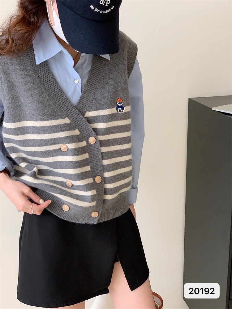 温柔风拼色条纹双排扣小标针织马甲背心 秋冬v领宽松休闲毛衣外套