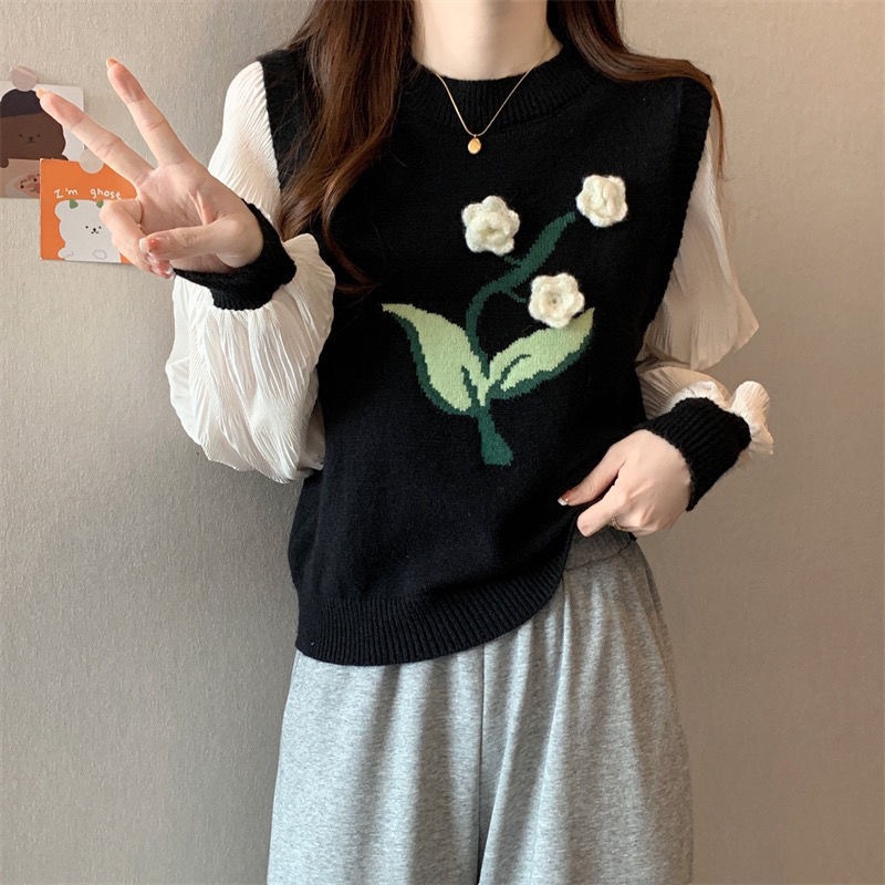 2023春秋新款假两件大码胖MM重工立体花针织上衣拼接设计感长袖女