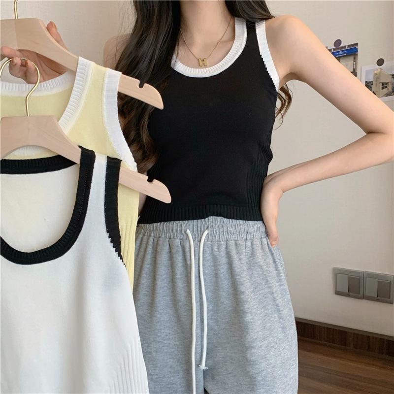 辣妹拼接撞色短款针织吊带背心女夏季新款韩版修身无袖打底上衣潮