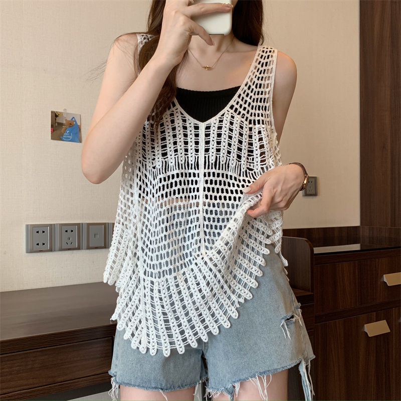 吊带女内搭夏季辣妹设计感钩花镂空针织马甲背心外搭无袖罩衫上衣