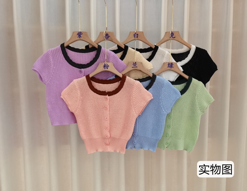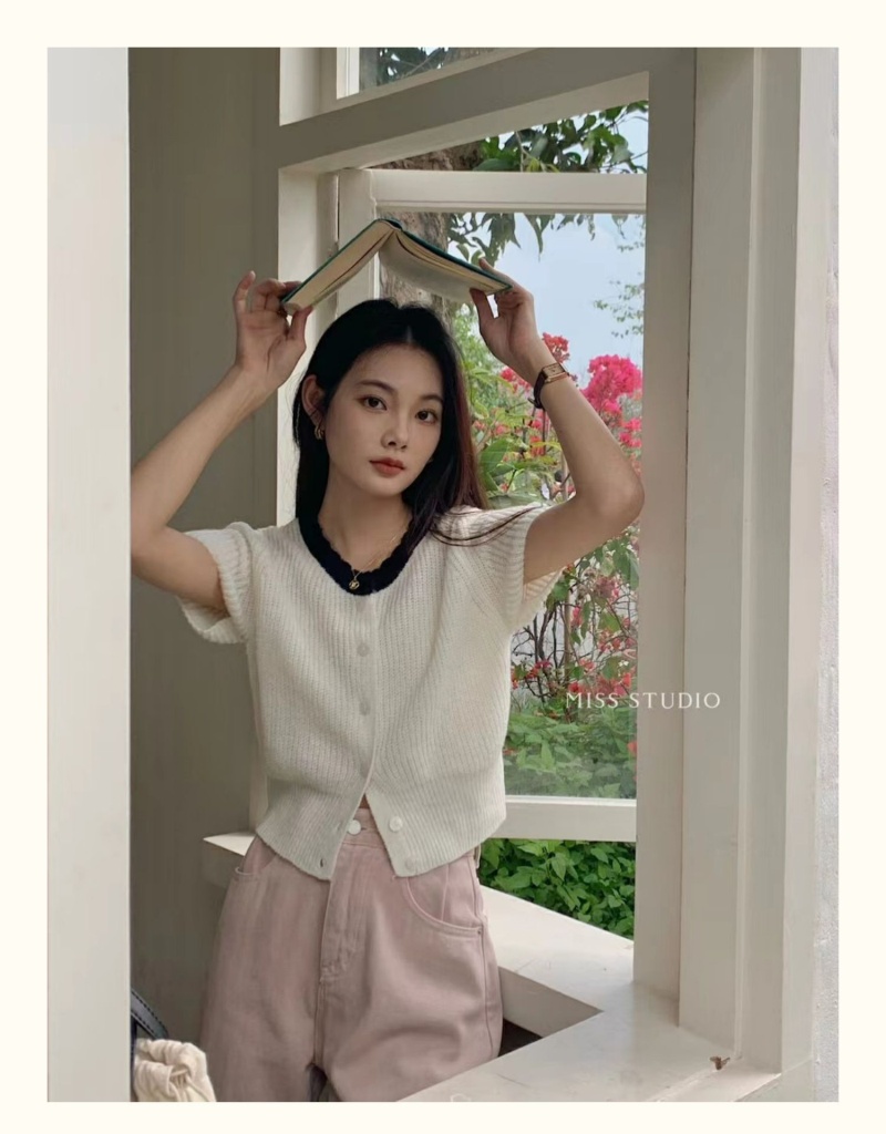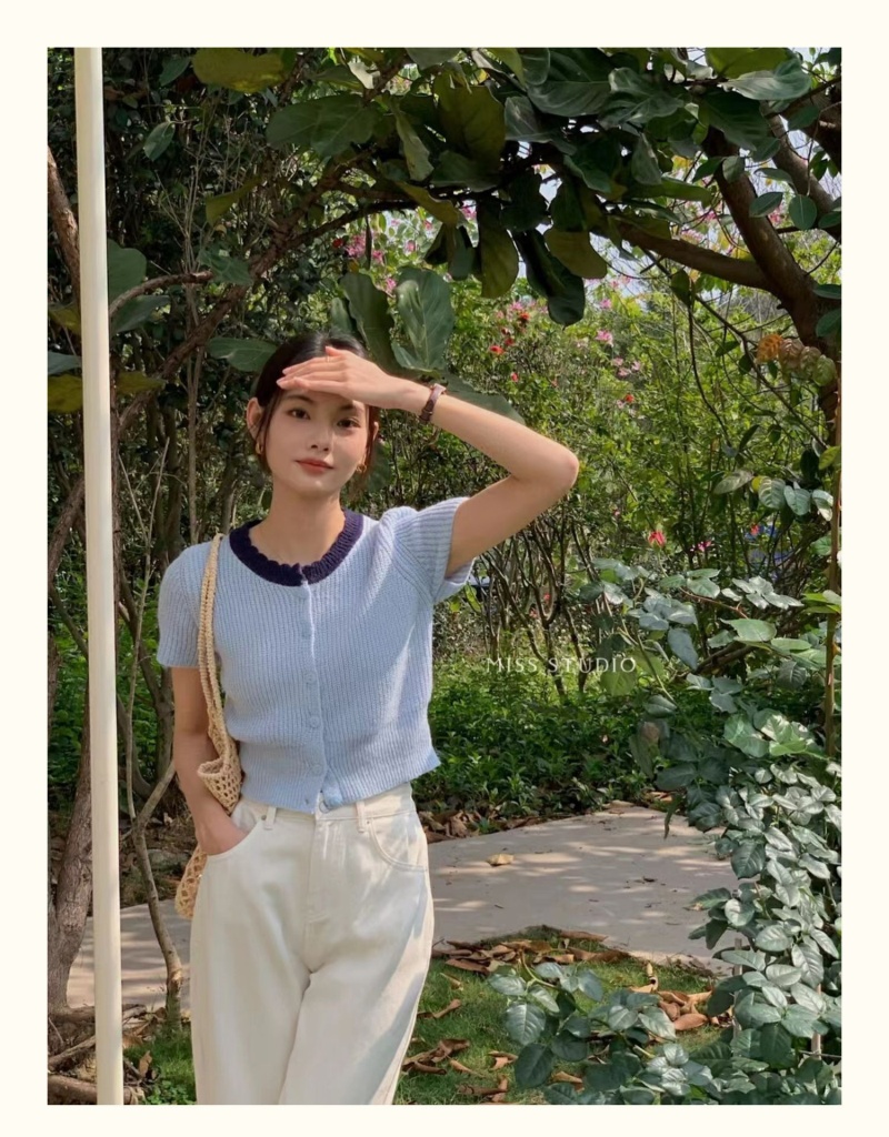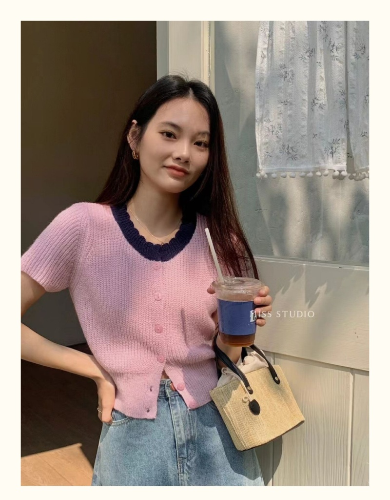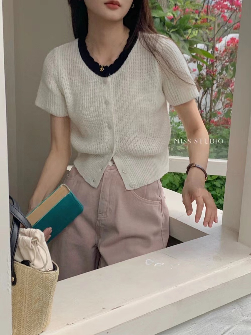 短袖针织开衫2023夏季新款韩版元气少女拼色高腰波浪领单排扣上衣