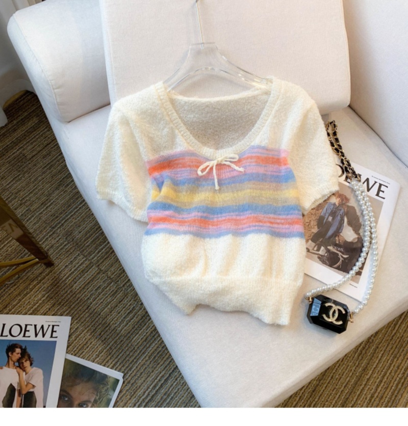 2023夏季新款甜美撞色蝴蝶结条纹针织衫修身百搭显瘦高级感上衣女