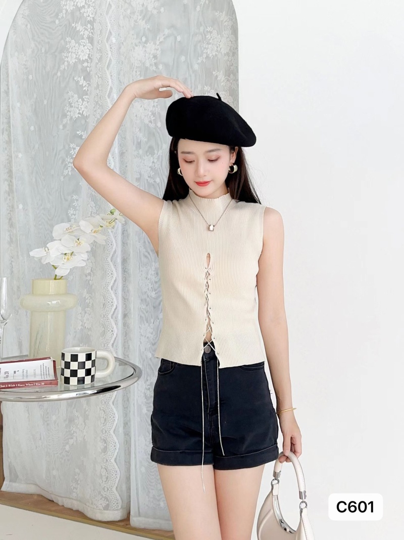 2023夏季新款纯色无袖镂空修身显瘦针织背心系带重工设计感上衣女
