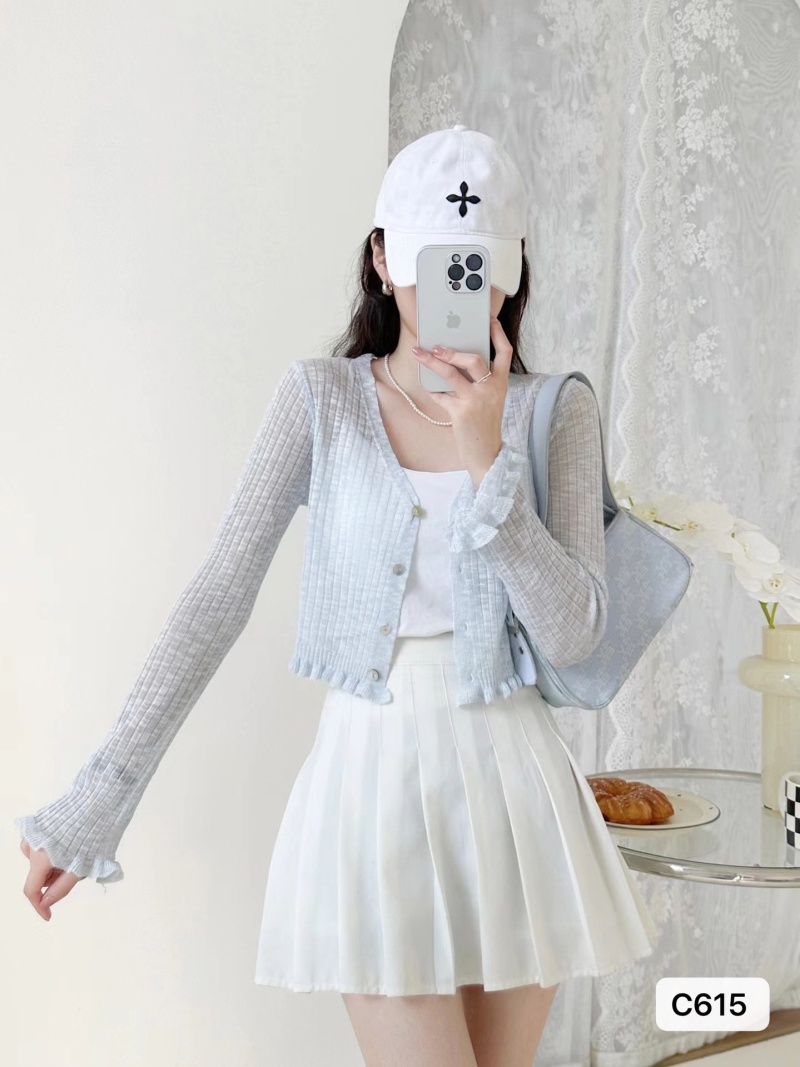 夏季温柔系木耳边V领长袖防晒冰丝针织开衫 百搭罩衫空调外套上衣