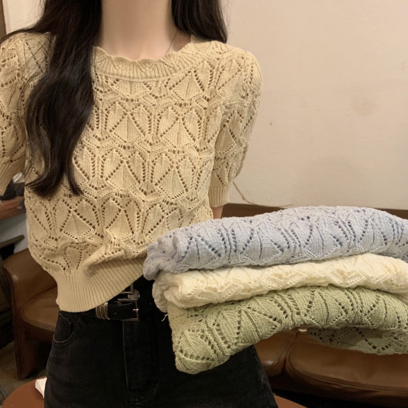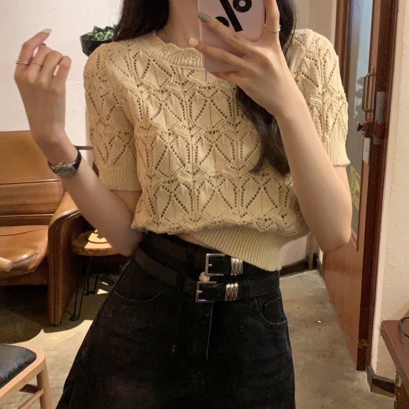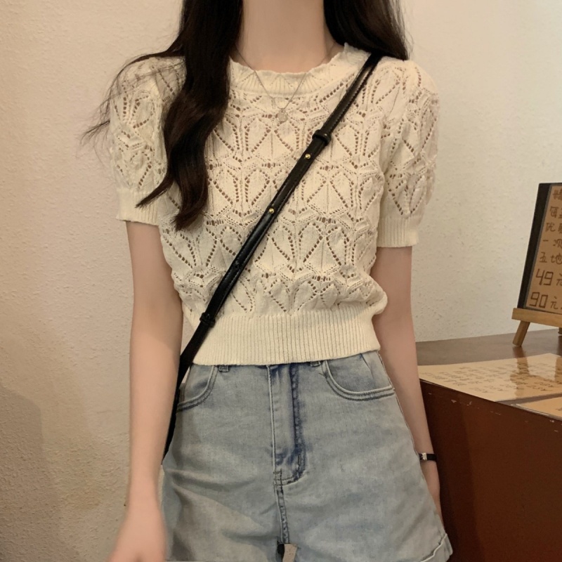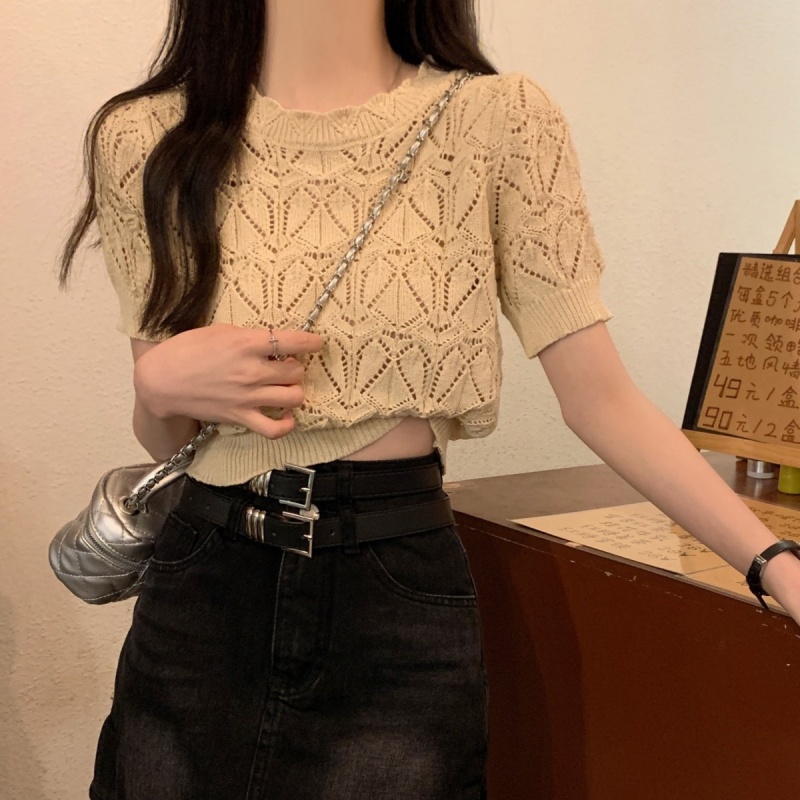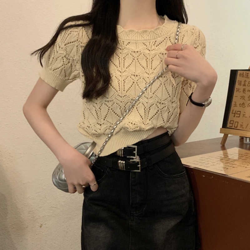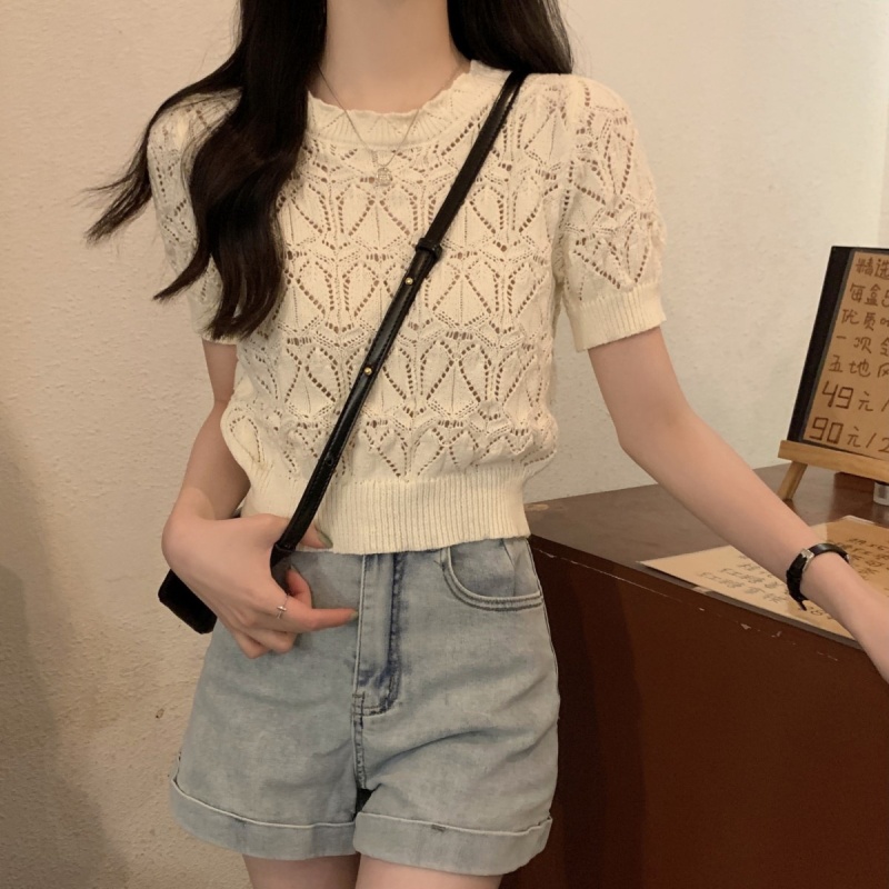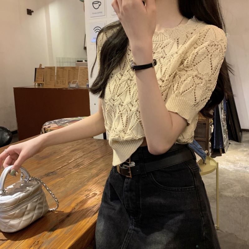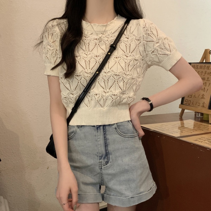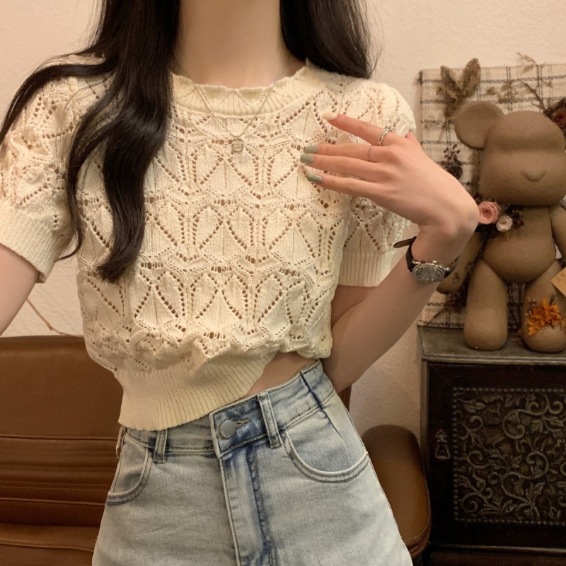 2023年春夏新款韩版圆领镂空勾花设计感宽松针织衫短袖上衣女潮新