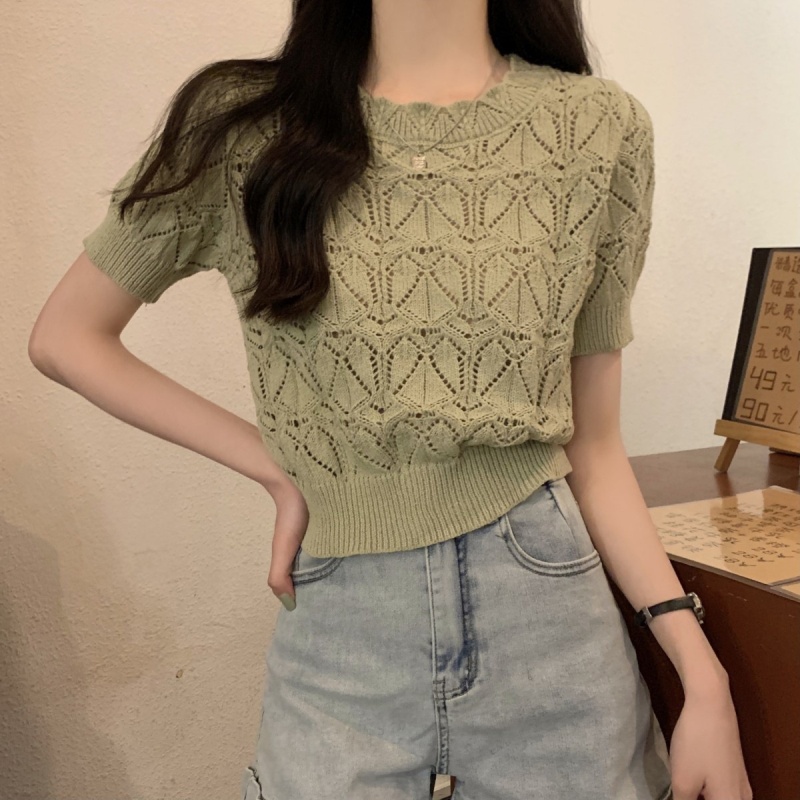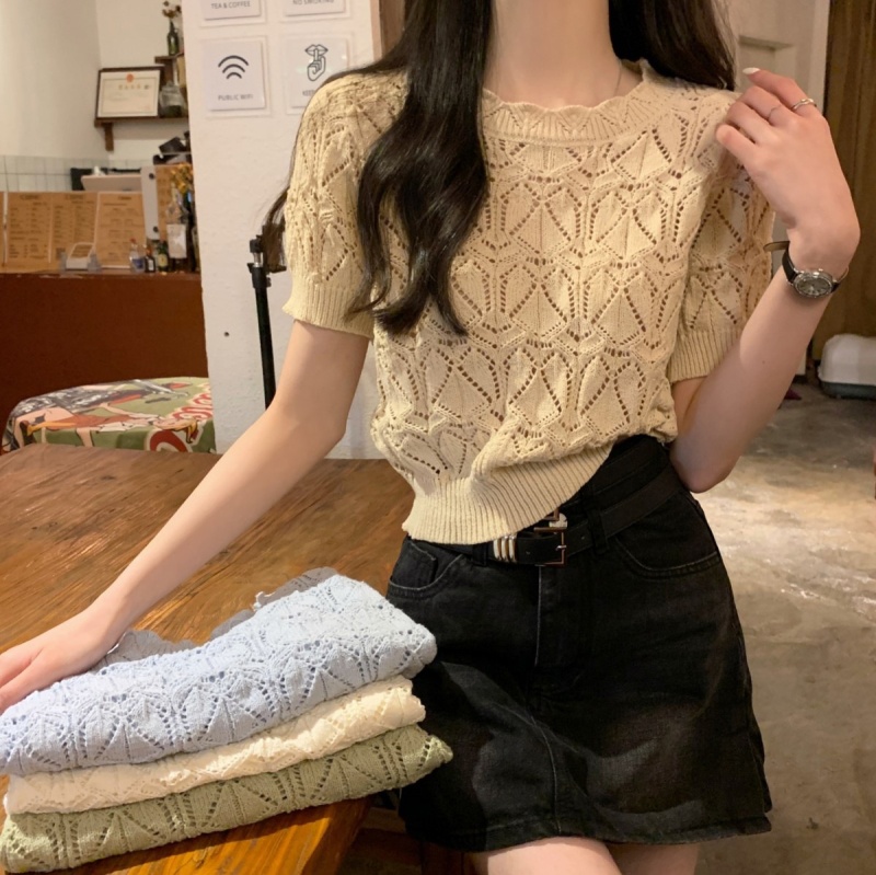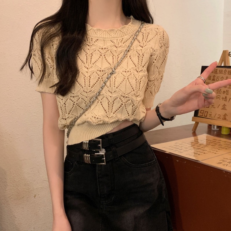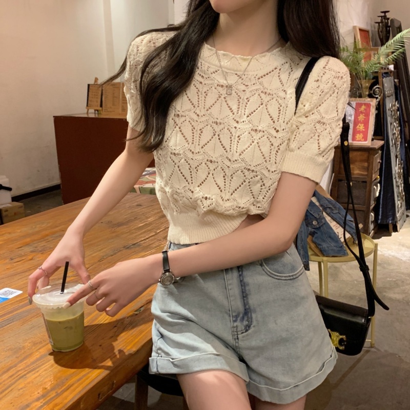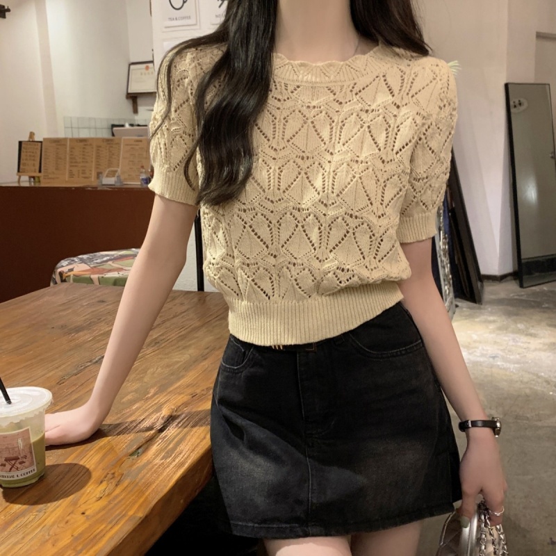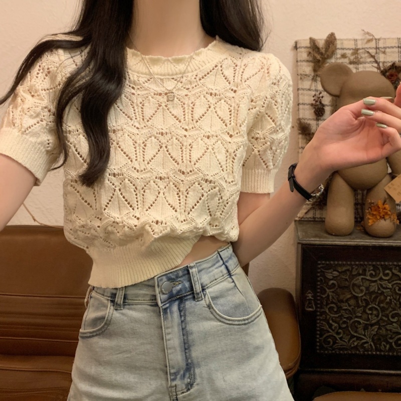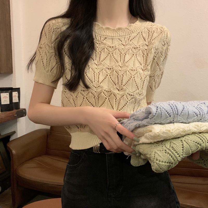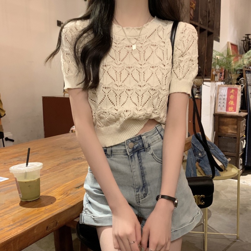 2023年春夏新款韩版圆领镂空勾花设计感宽松针织衫短袖上衣女潮新