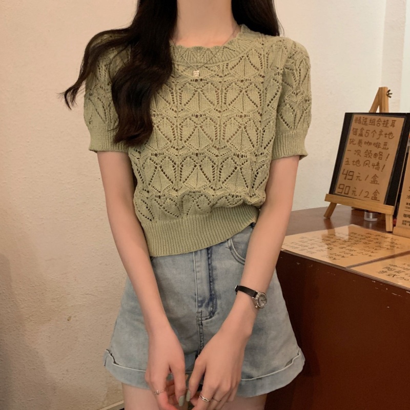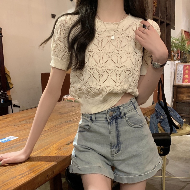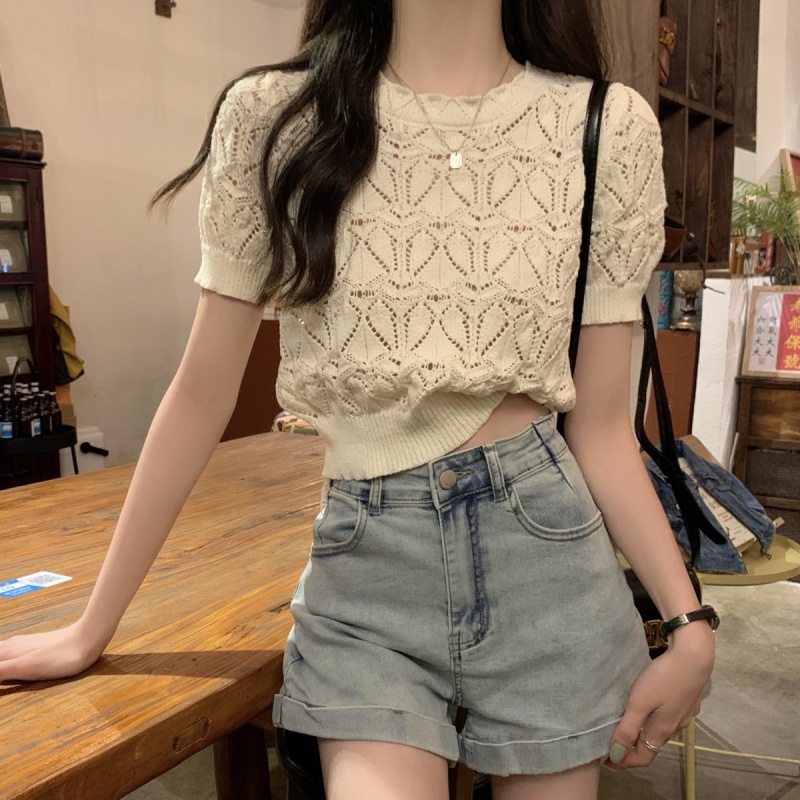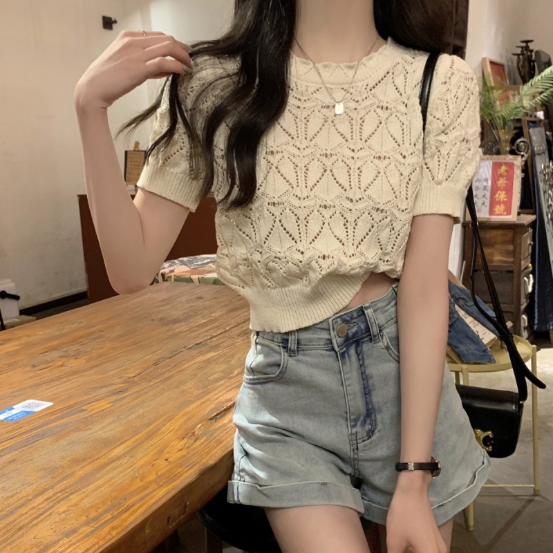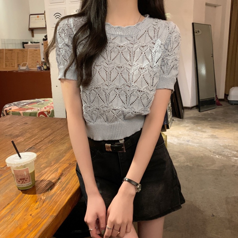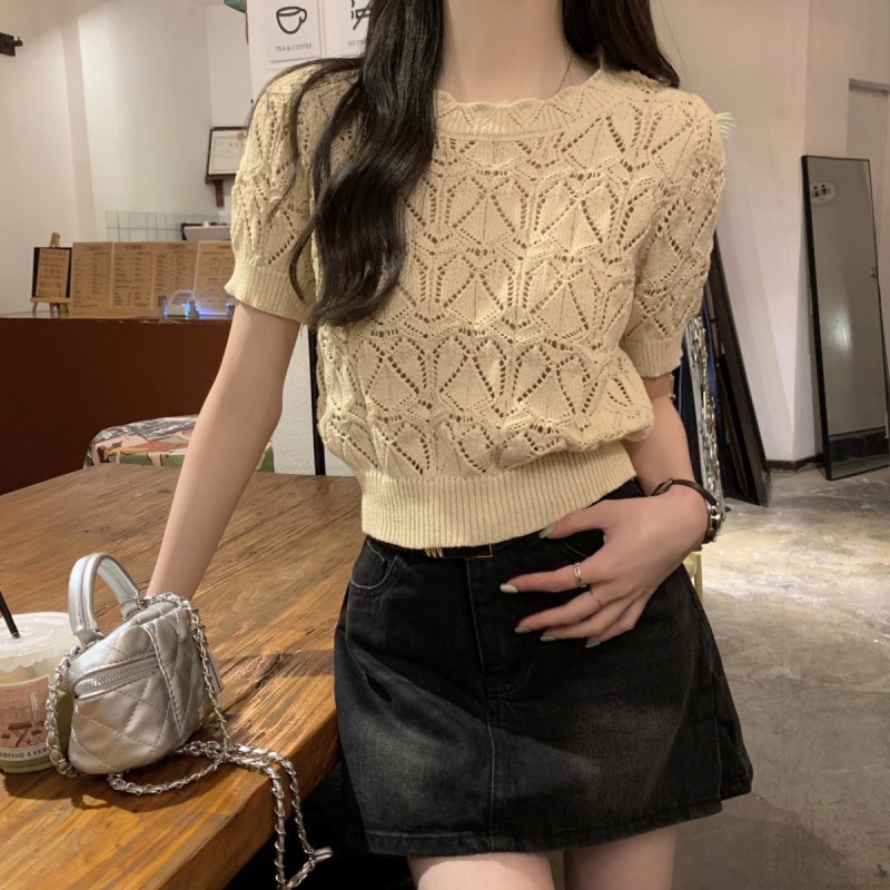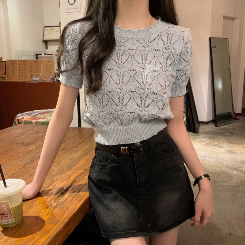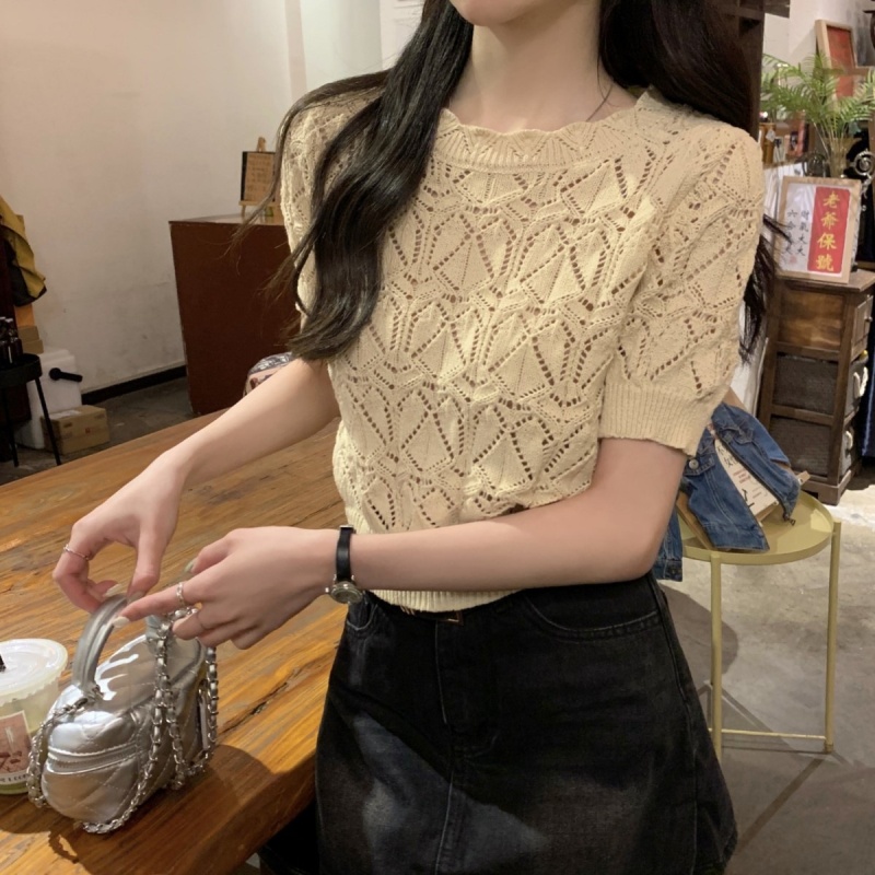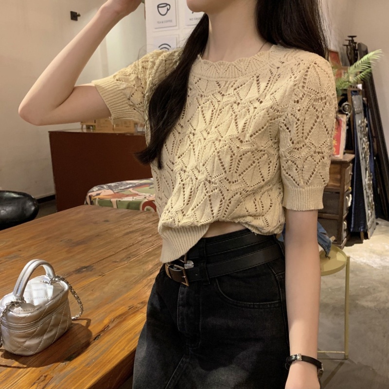 2023年春夏新款韩版圆领镂空勾花设计感宽松针织衫短袖上衣女潮新
