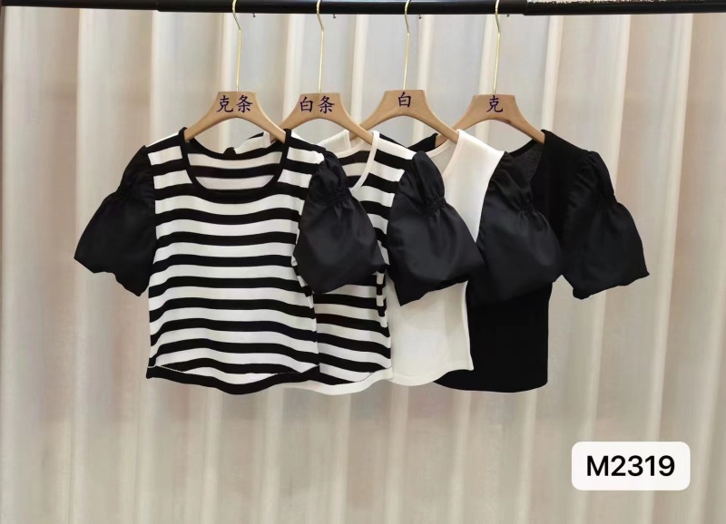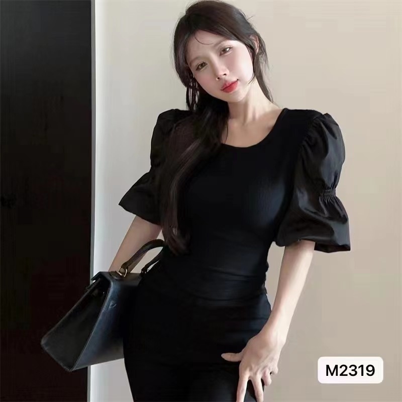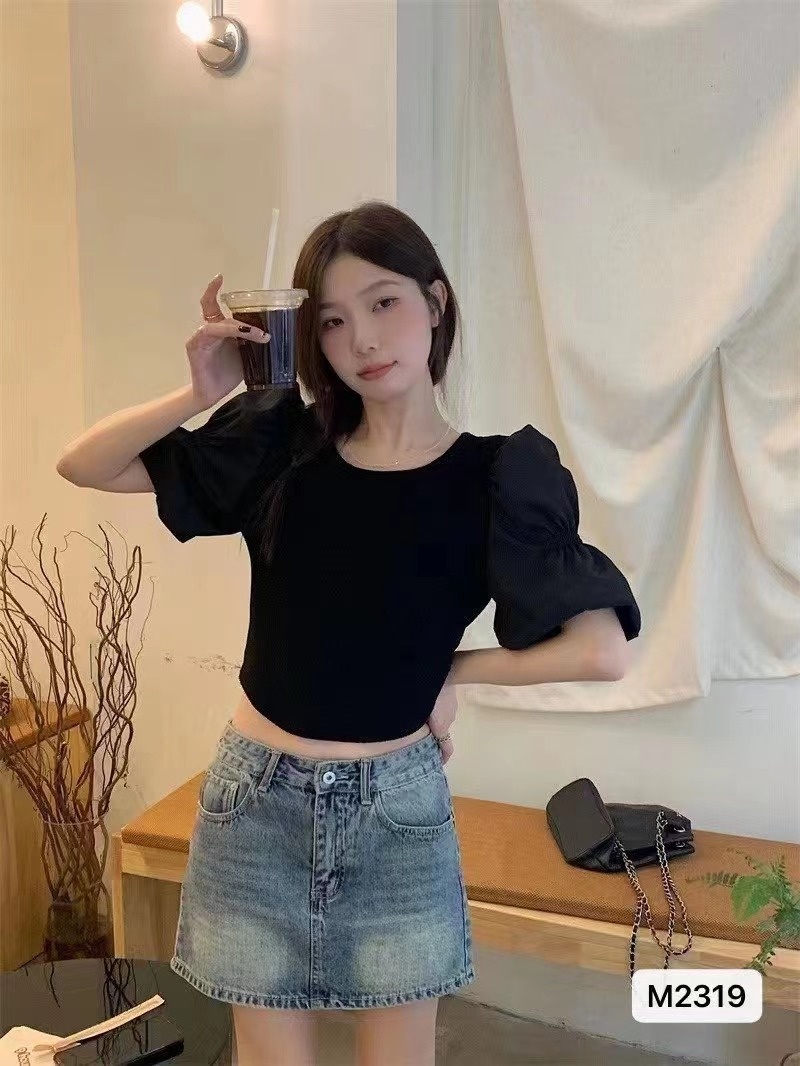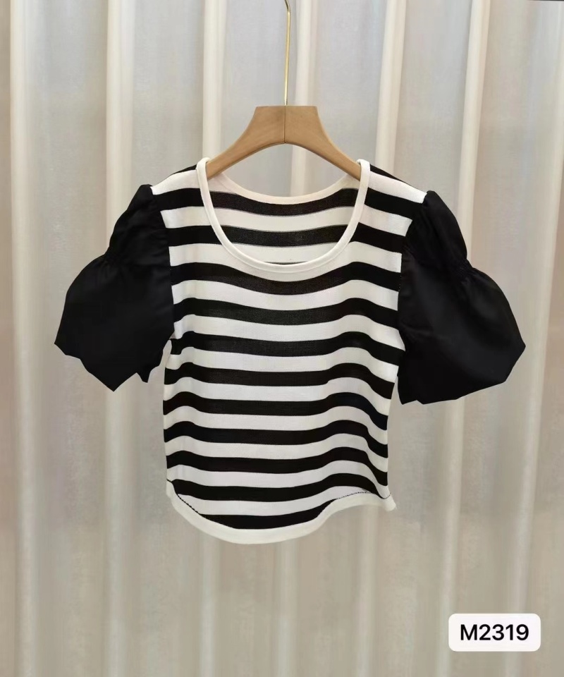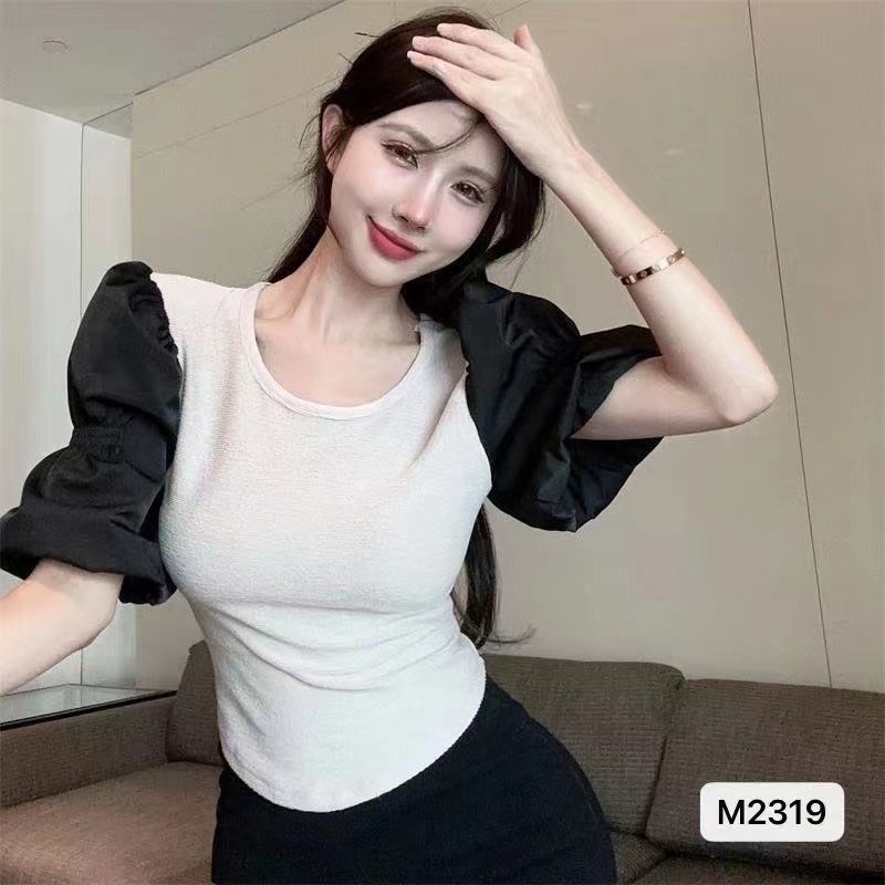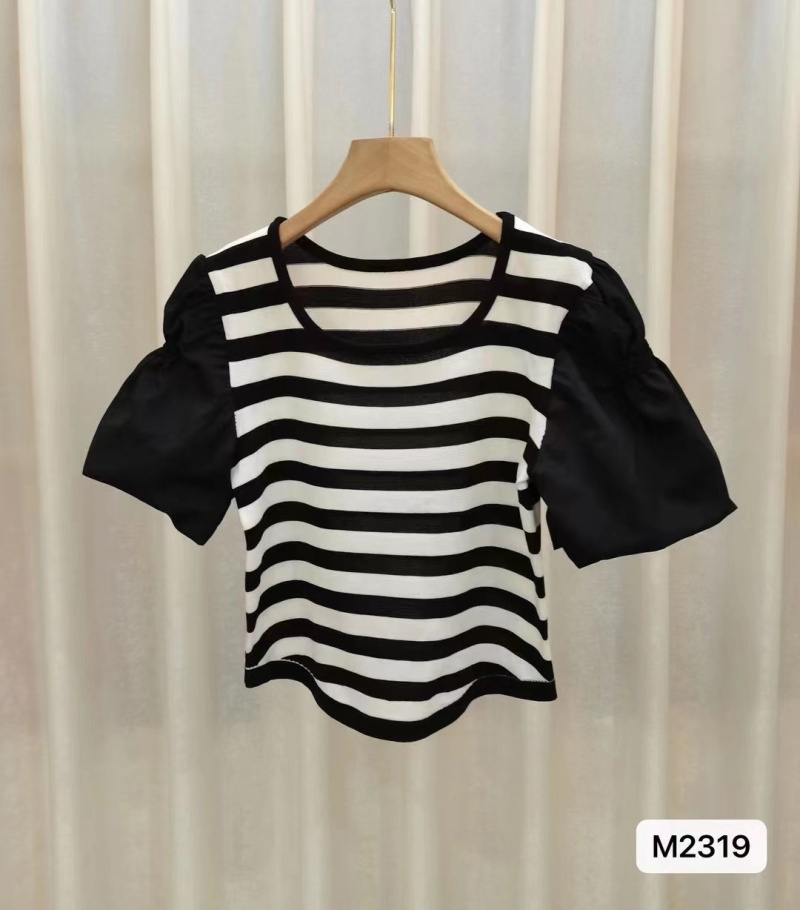 2023年夏季新款韩版时髦泡泡袖甜辣风圆领拼接泡泡短袖上衣女潮新