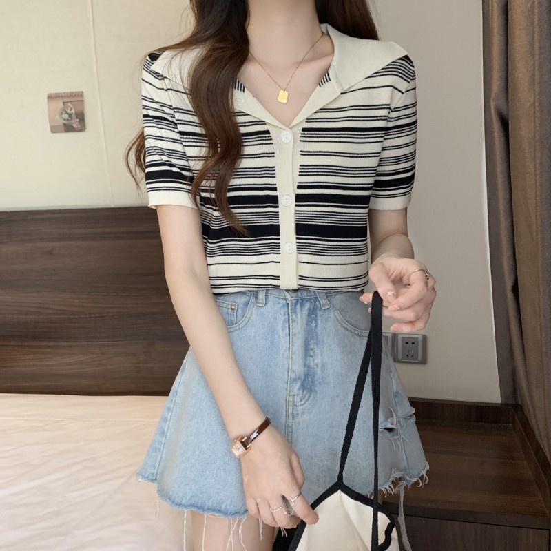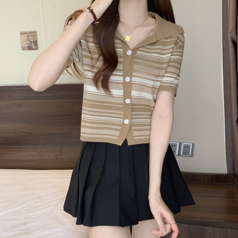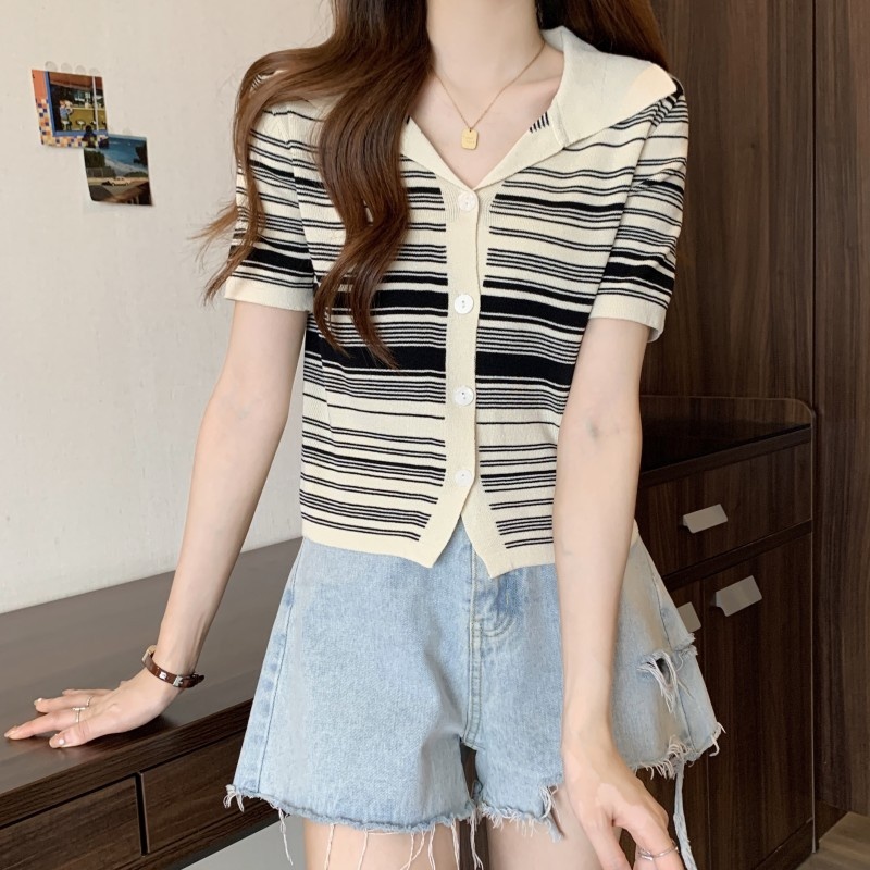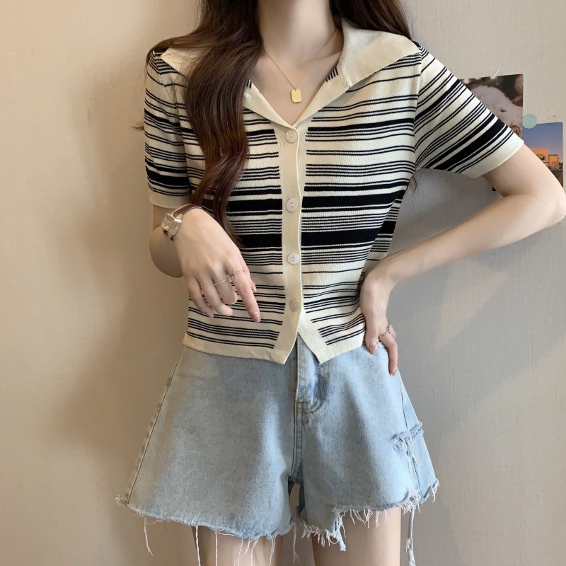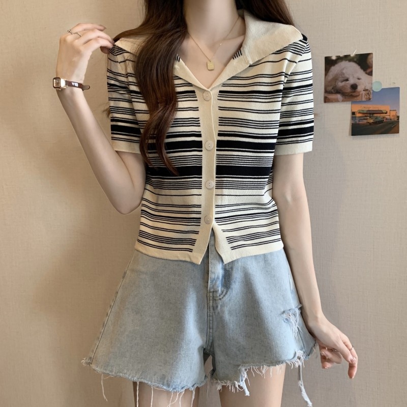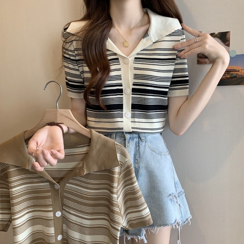 条纹翻领短款冰丝针织衫2023年夏季新款女洋气显瘦短袖上衣潮新女