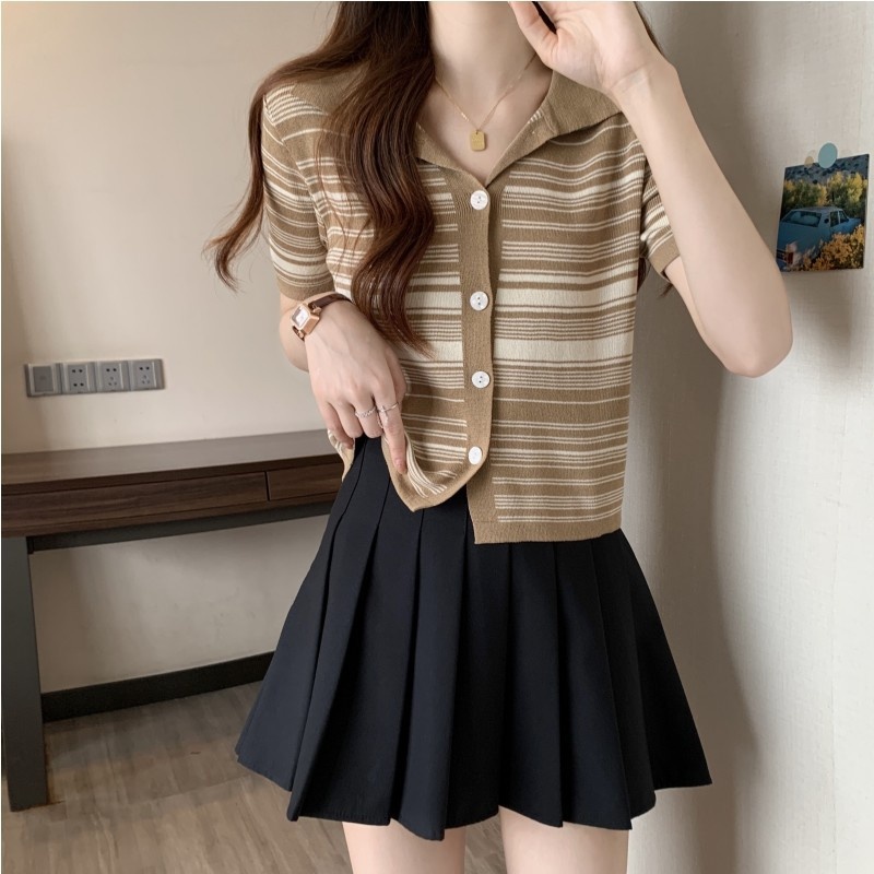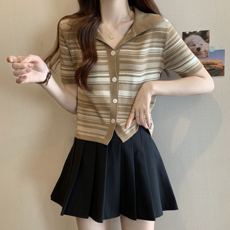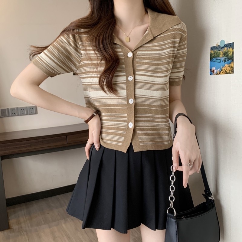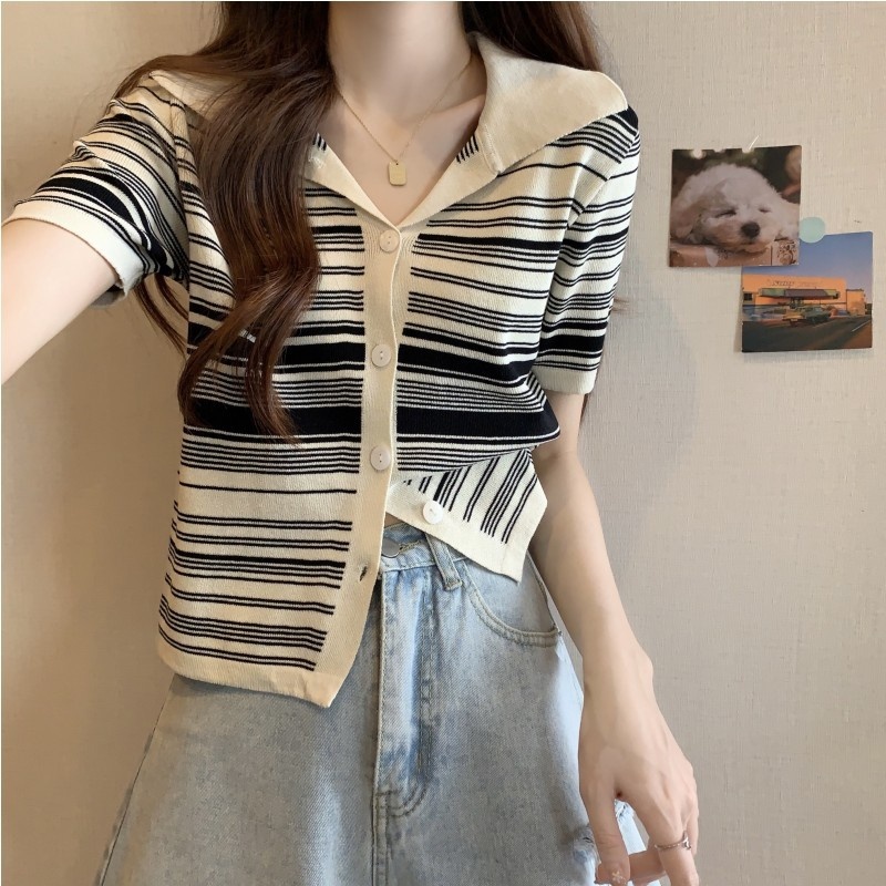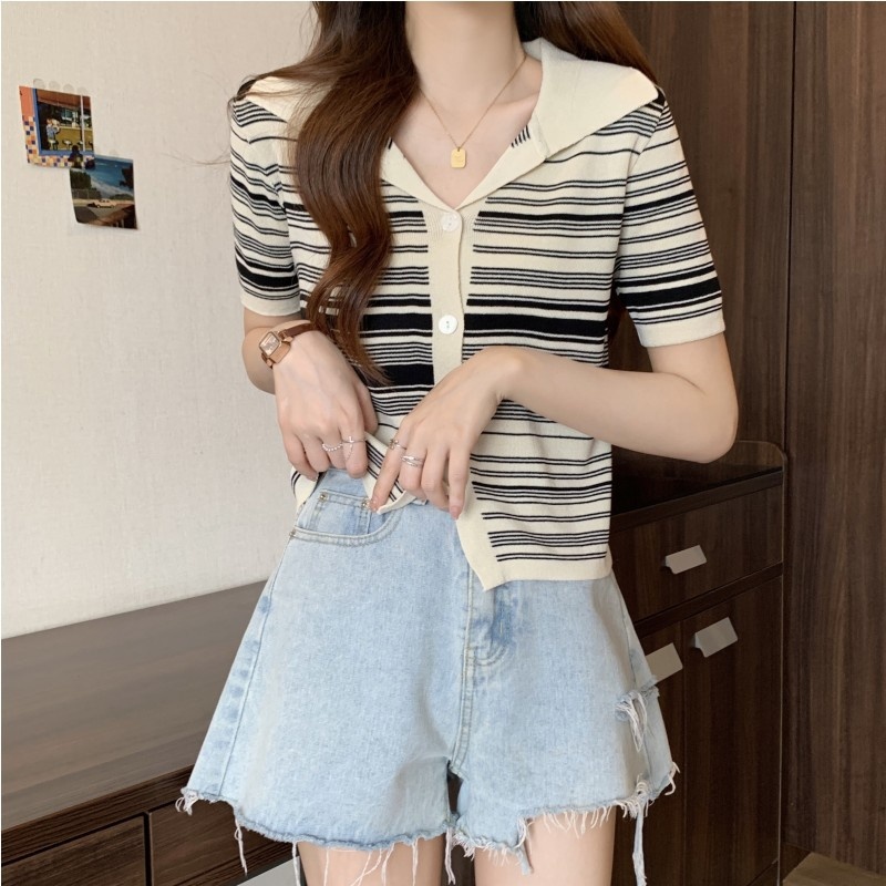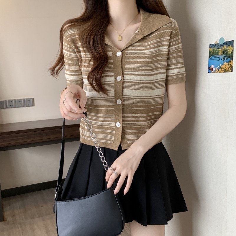 条纹翻领短款冰丝针织衫2023年夏季新款女洋气显瘦短袖上衣潮新女