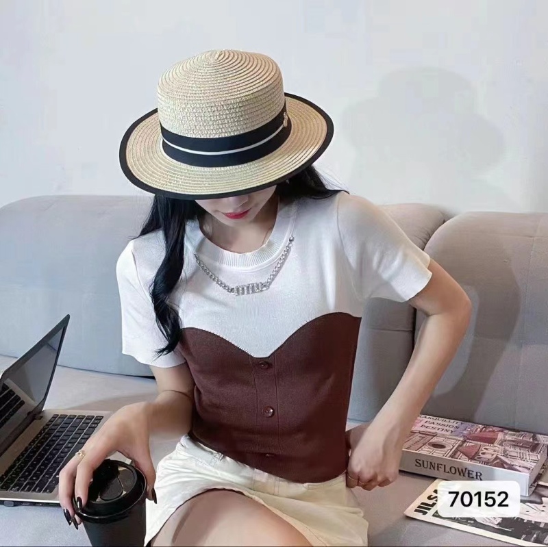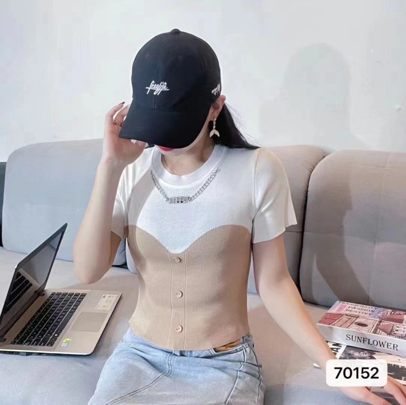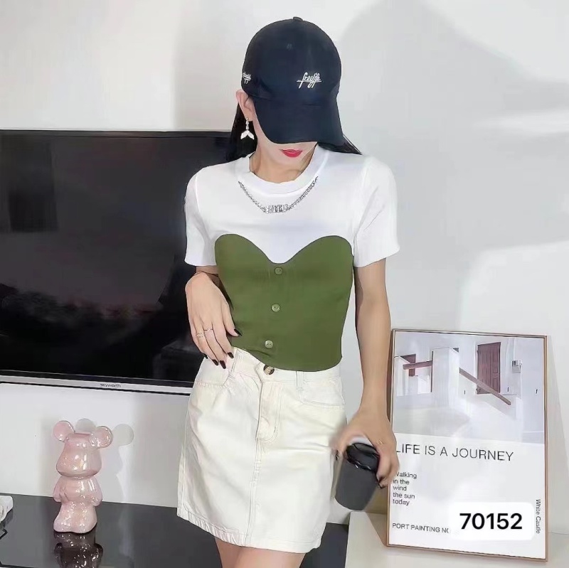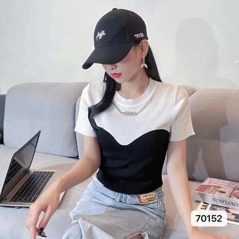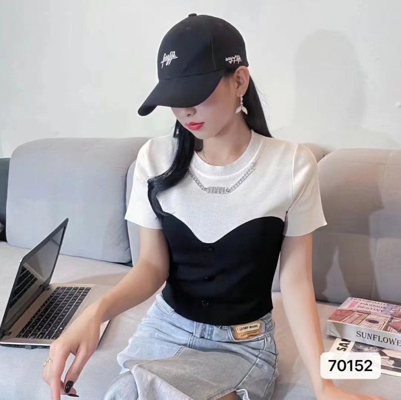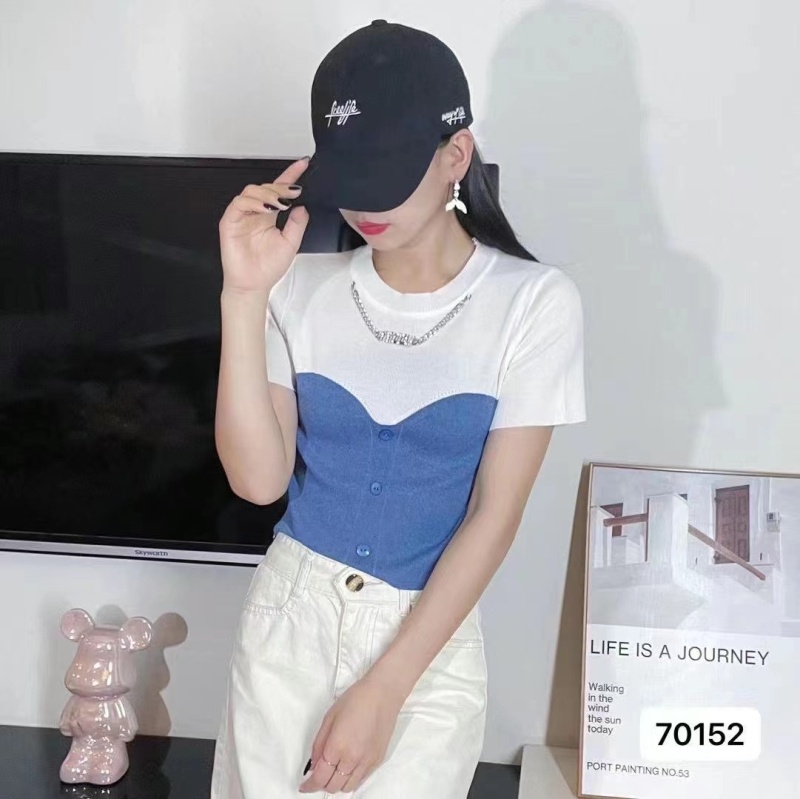 2023韩版时尚优雅气质通勤夏季新款链条挂饰假两件短袖上衣女潮新