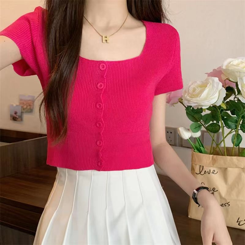 夏季甜辣纯欲方领单排扣露肚脐短袖针织衫短款糖果色修身百搭上衣