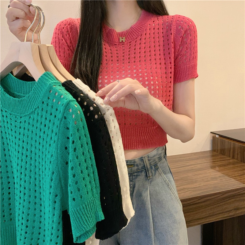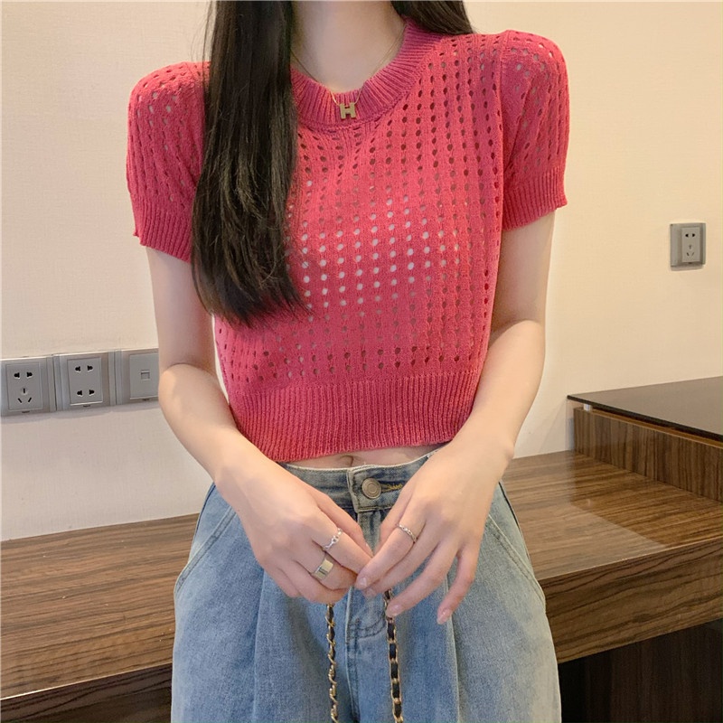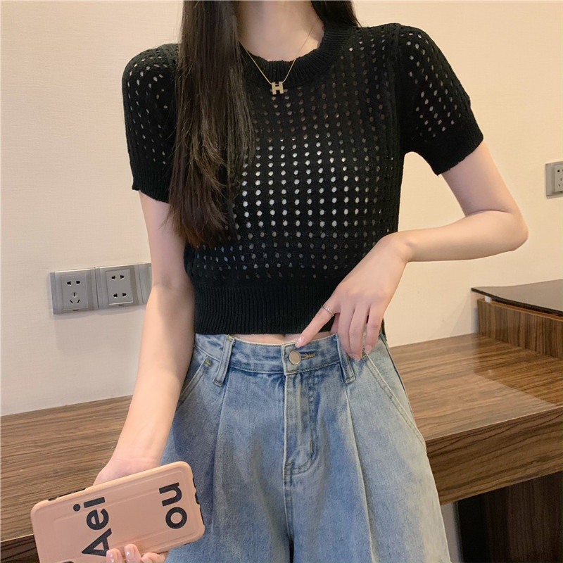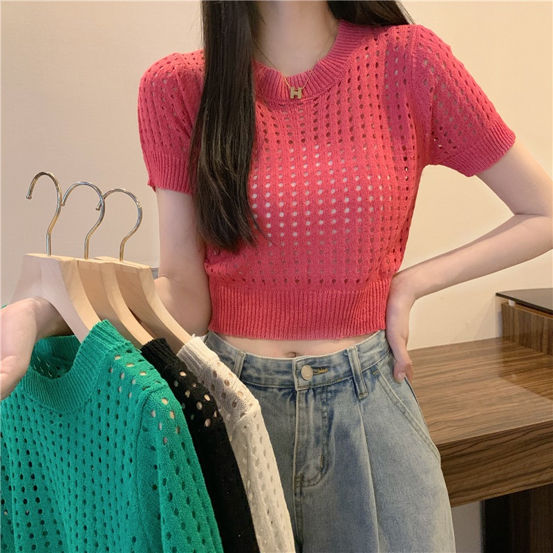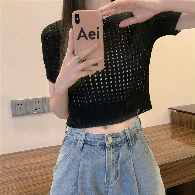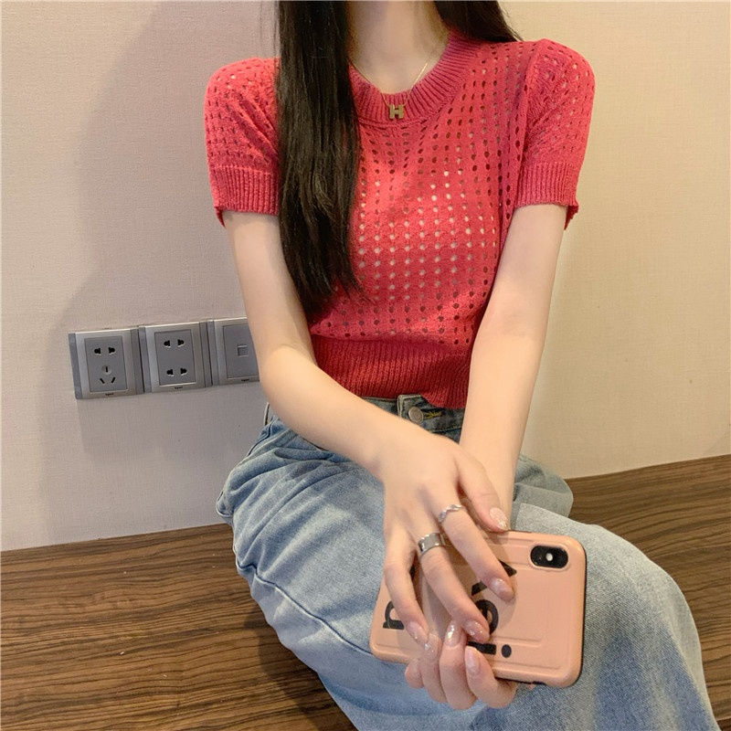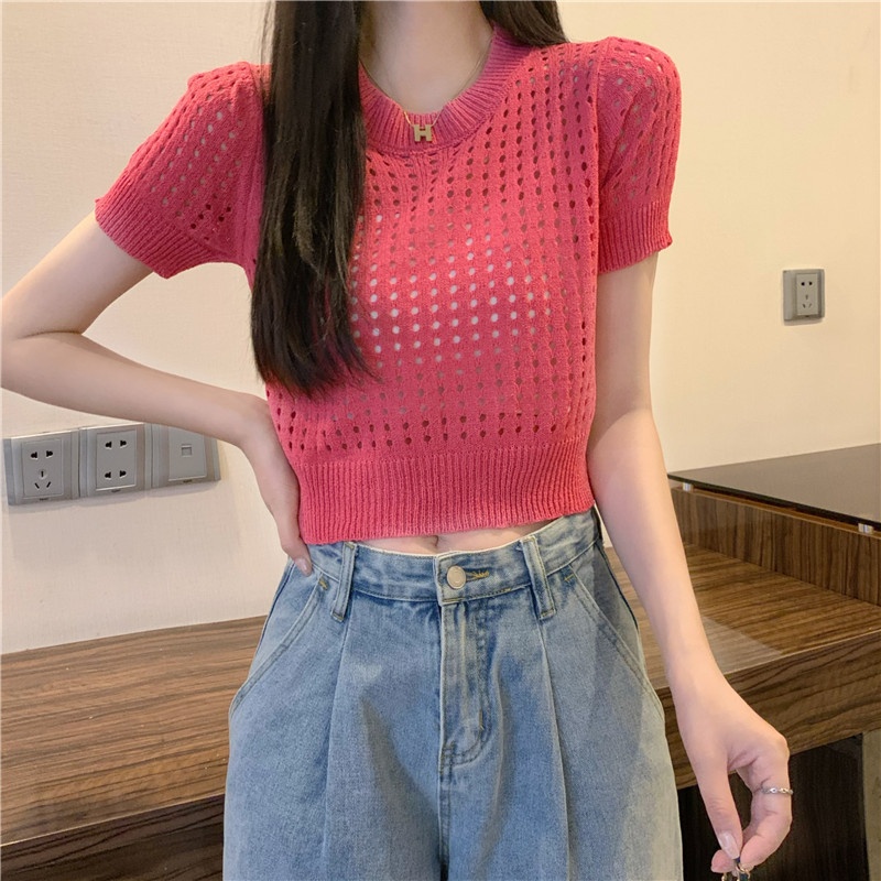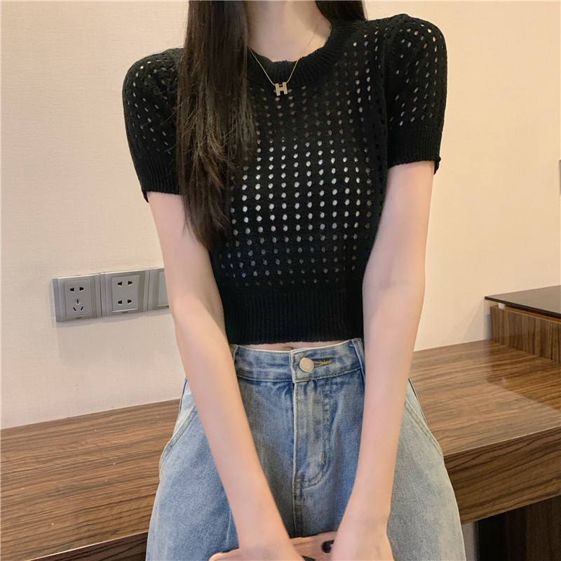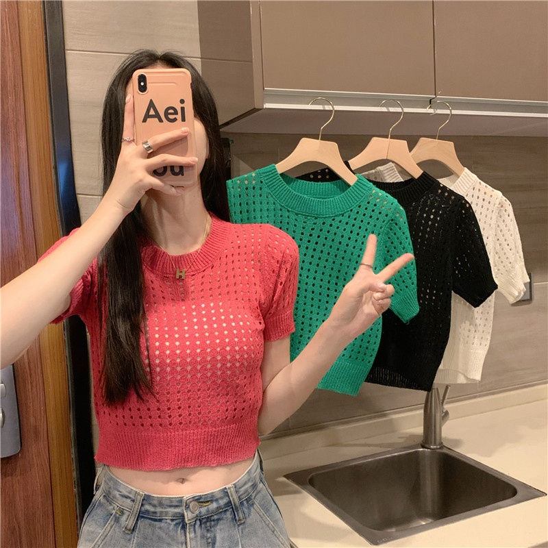 镂空短袖针织衫女夏甜辣慵懒风薄款别致修身短款套头t恤上衣女装