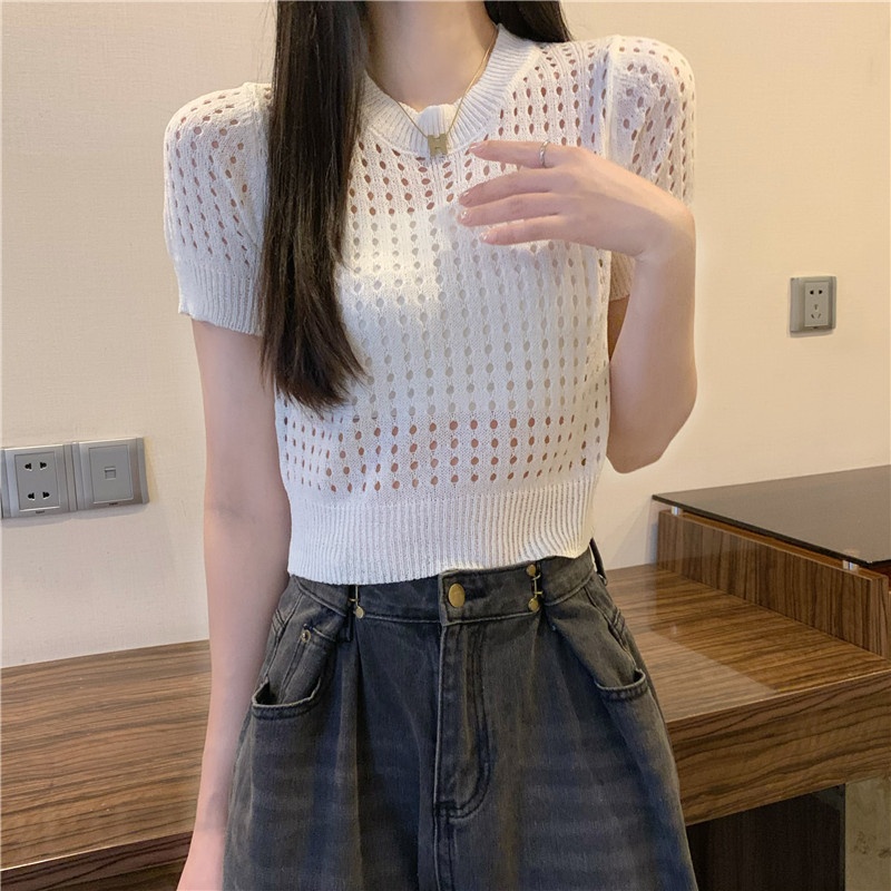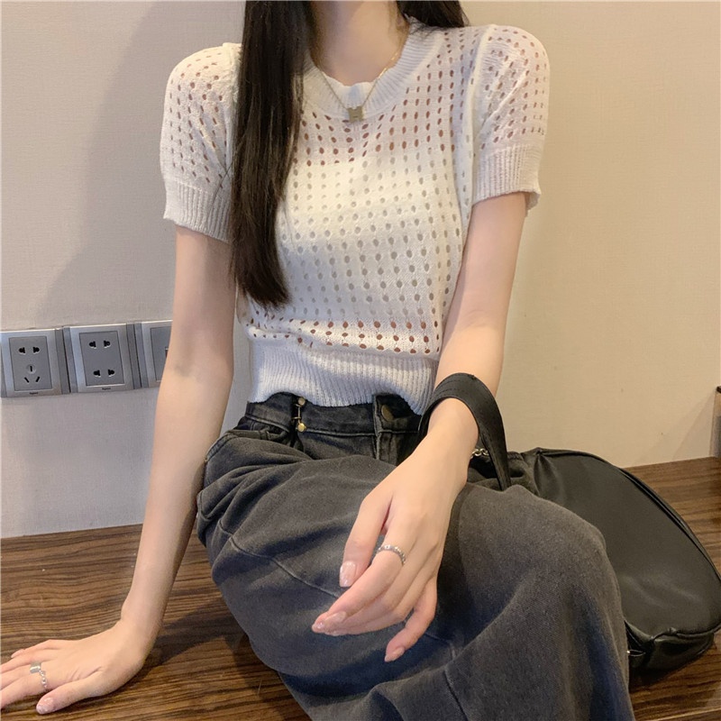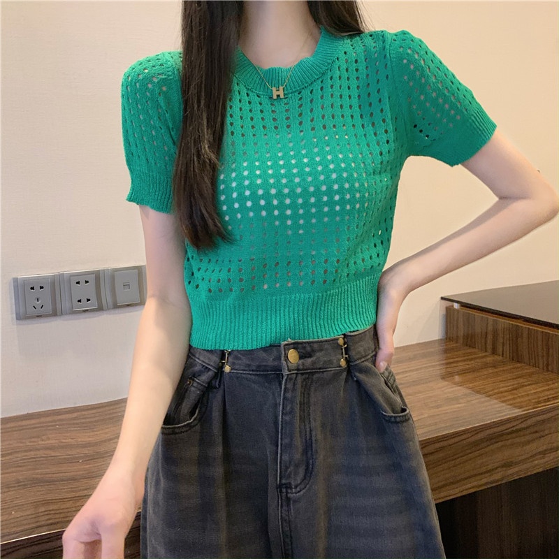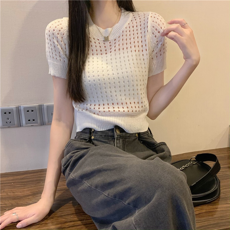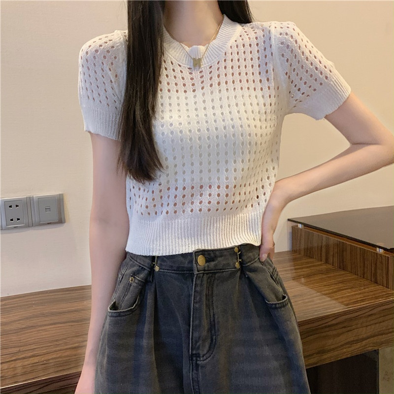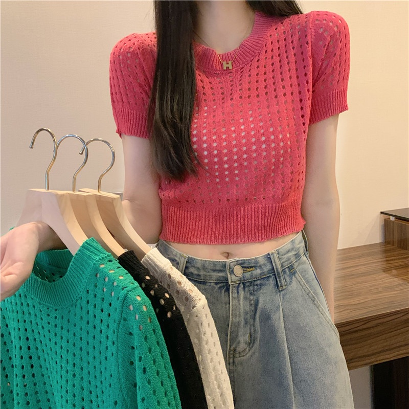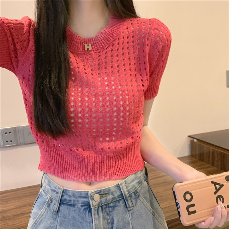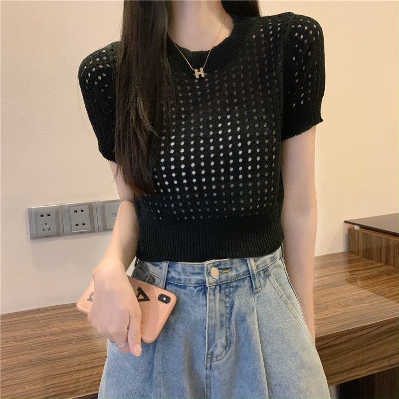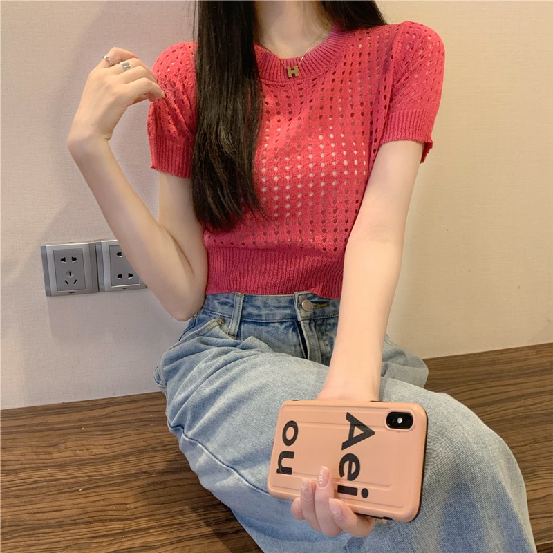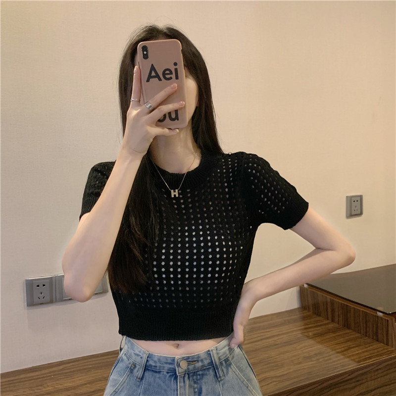 镂空短袖针织衫女夏甜辣慵懒风薄款别致修身短款套头t恤上衣女装