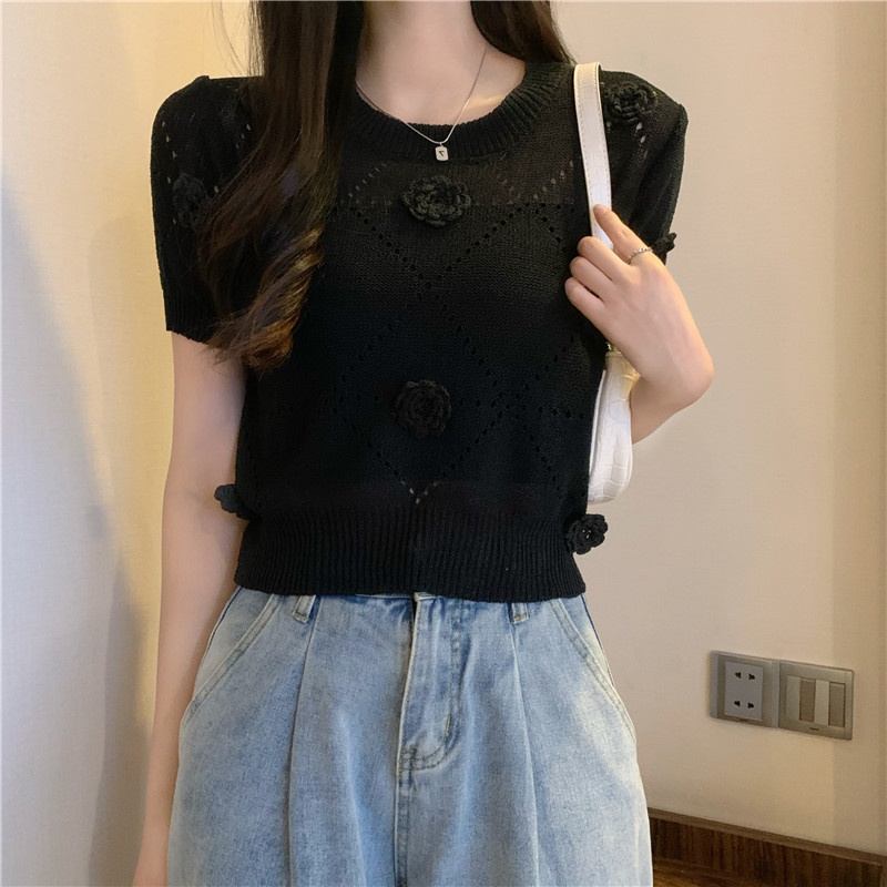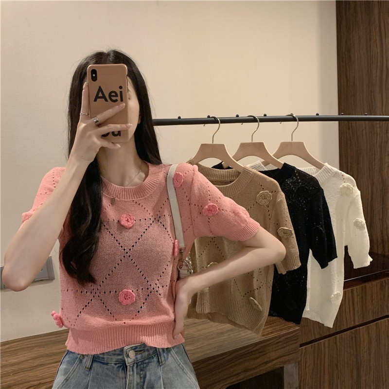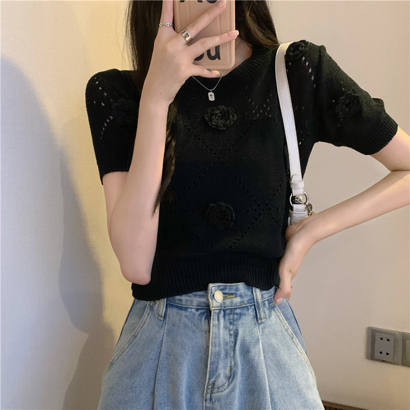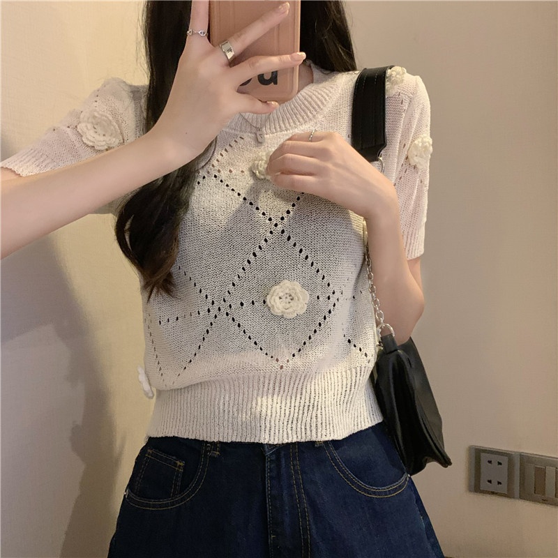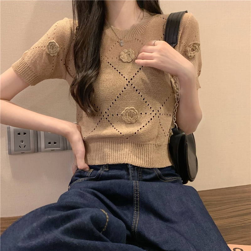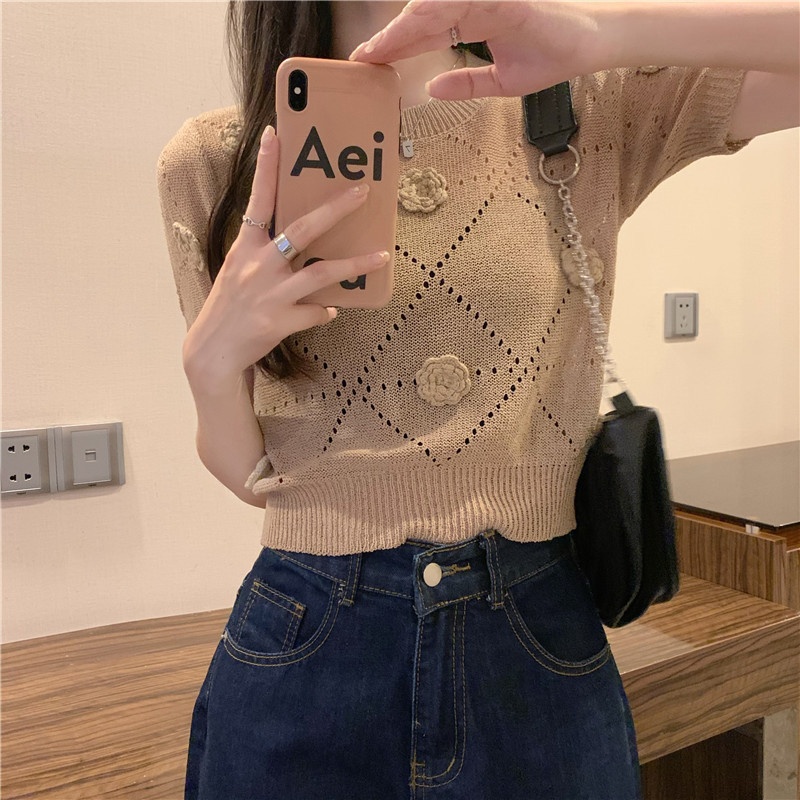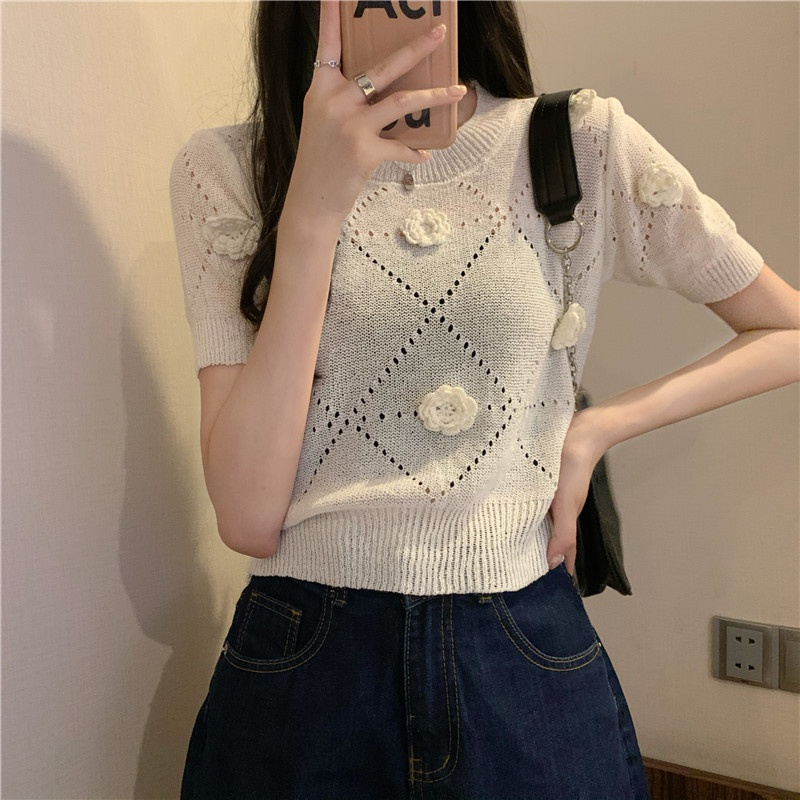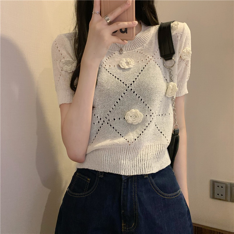 夏季新款设计感立体钩花镂空针织衫小众短袖针织衫短款T恤上衣女