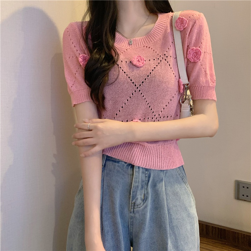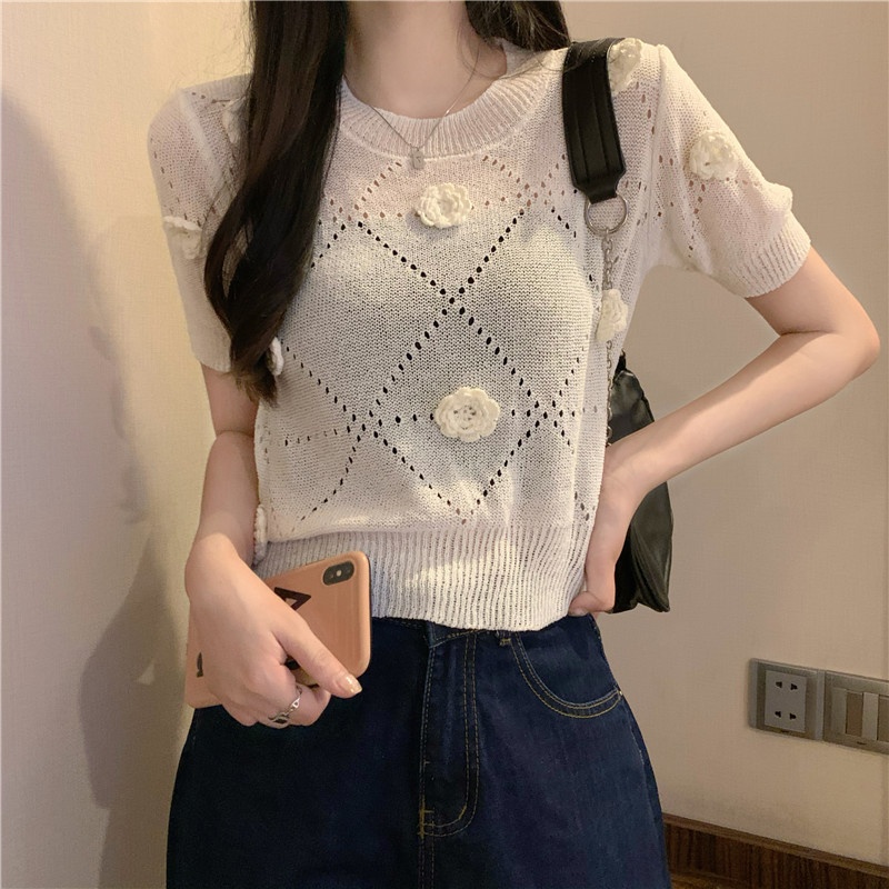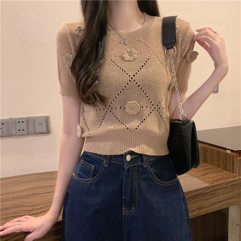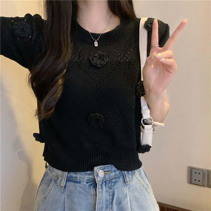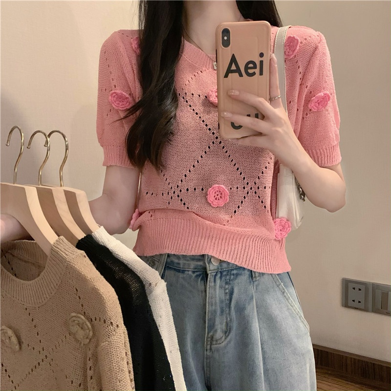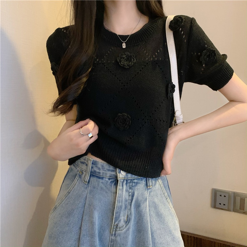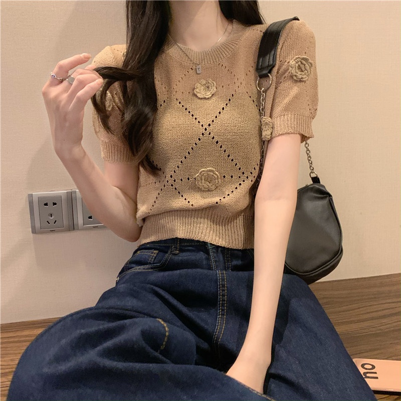 夏季新款设计感立体钩花镂空针织衫小众短袖针织衫短款T恤上衣女