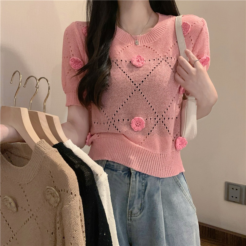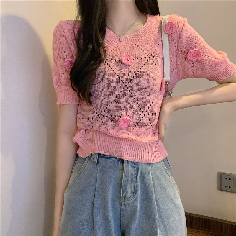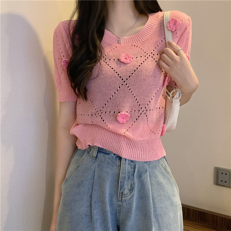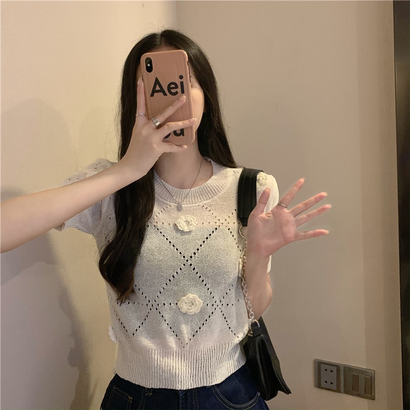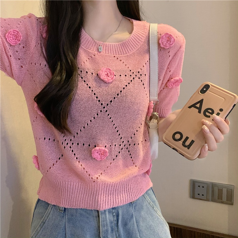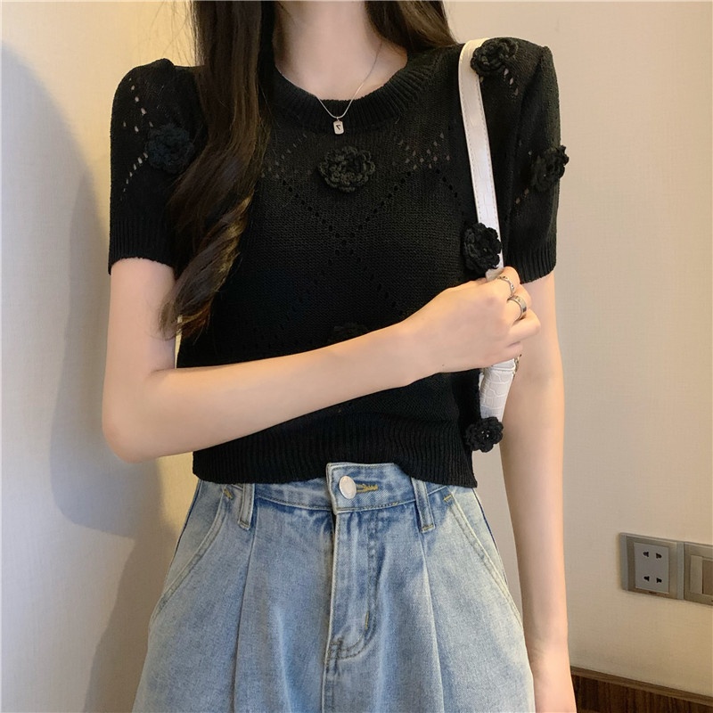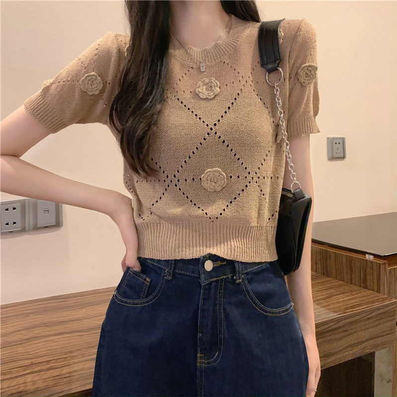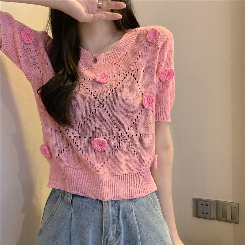 夏季新款设计感立体钩花镂空针织衫小众短袖针织衫短款T恤上衣女