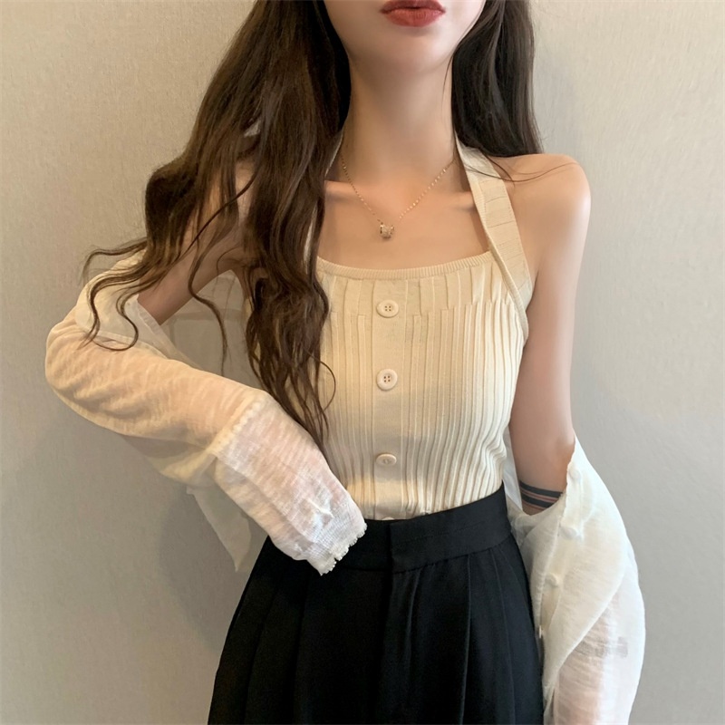 夏季短款纯色法式针织薄款挂脖吊带性感辣妹外穿露背加工定制上衣