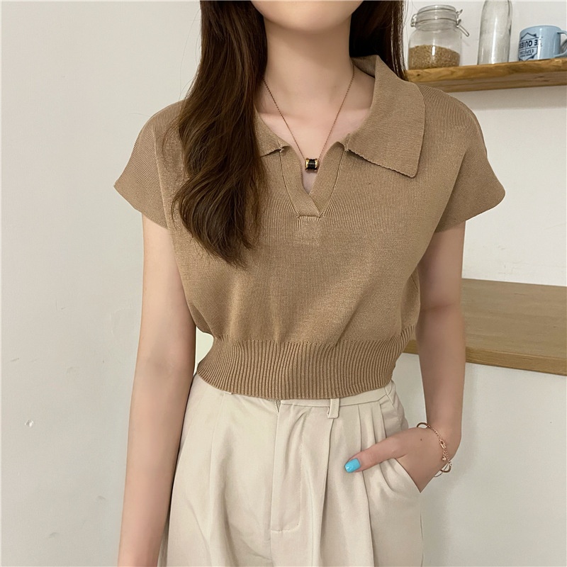 夏季气质修身翻领纯色POLO衫显瘦休闲百搭短款漏肚脐针织衫上衣女