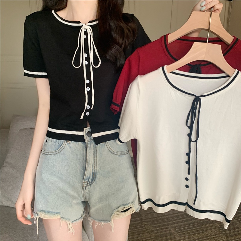 系带撞色针织短袖开衫夏季圆领纽扣设计感上衣短款小香风修身女装