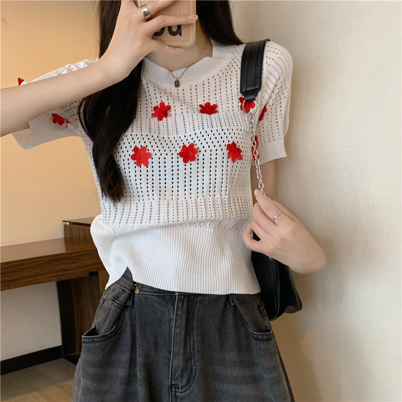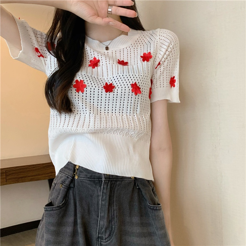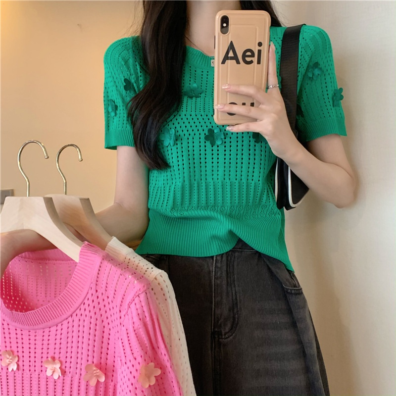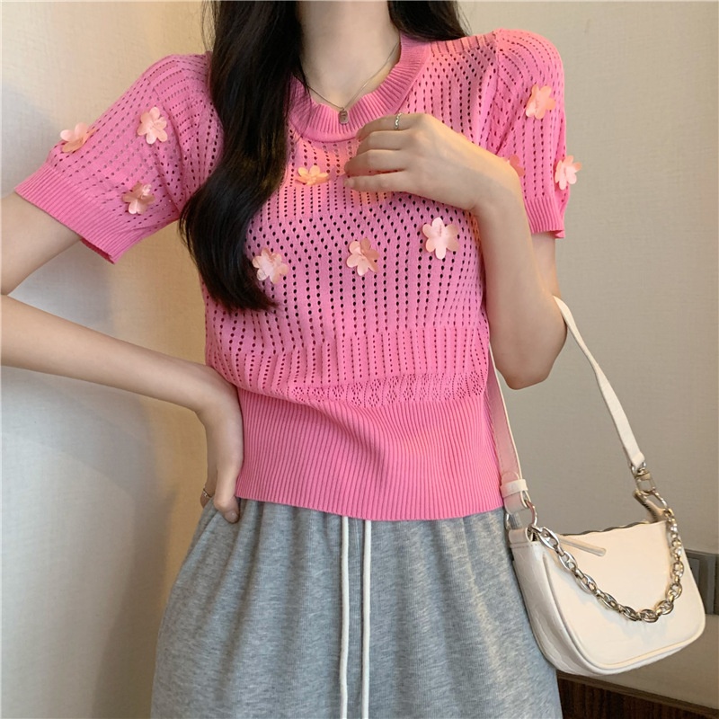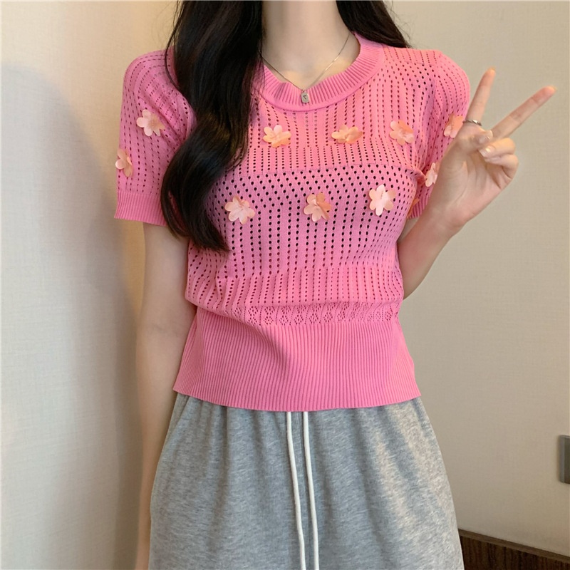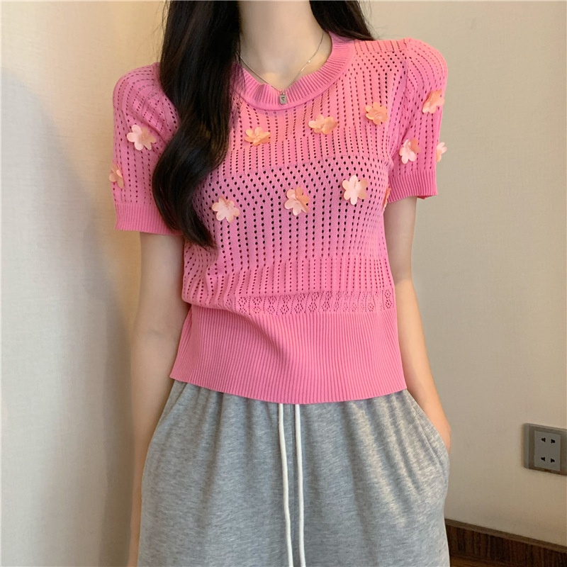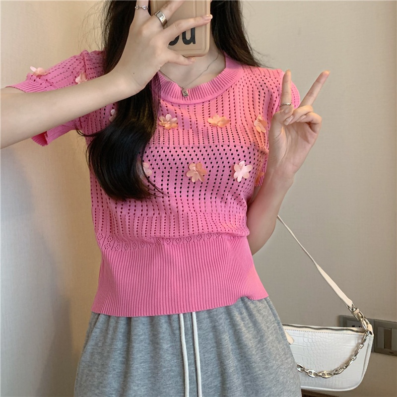 冰丝镂空高级感立体花朵针织衫套头圆领小香风短款短袖t恤上衣女