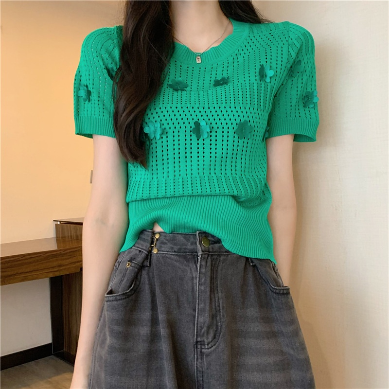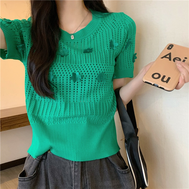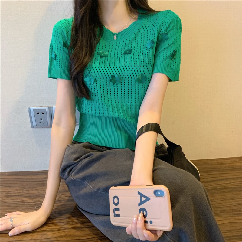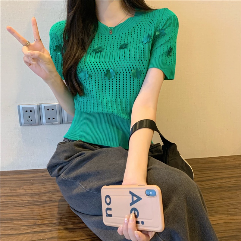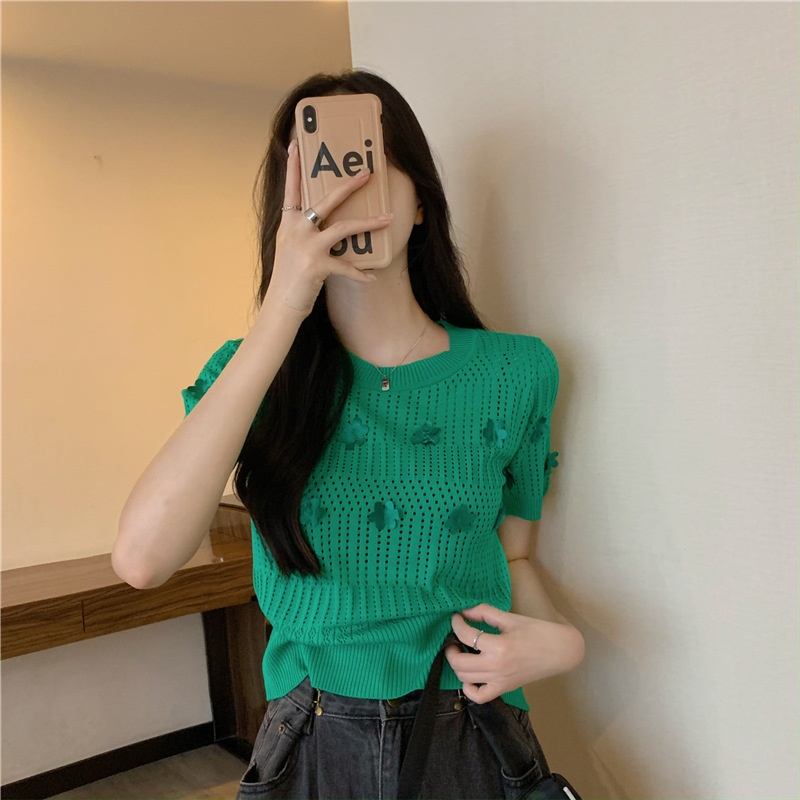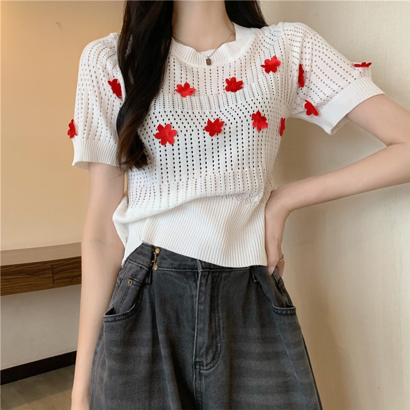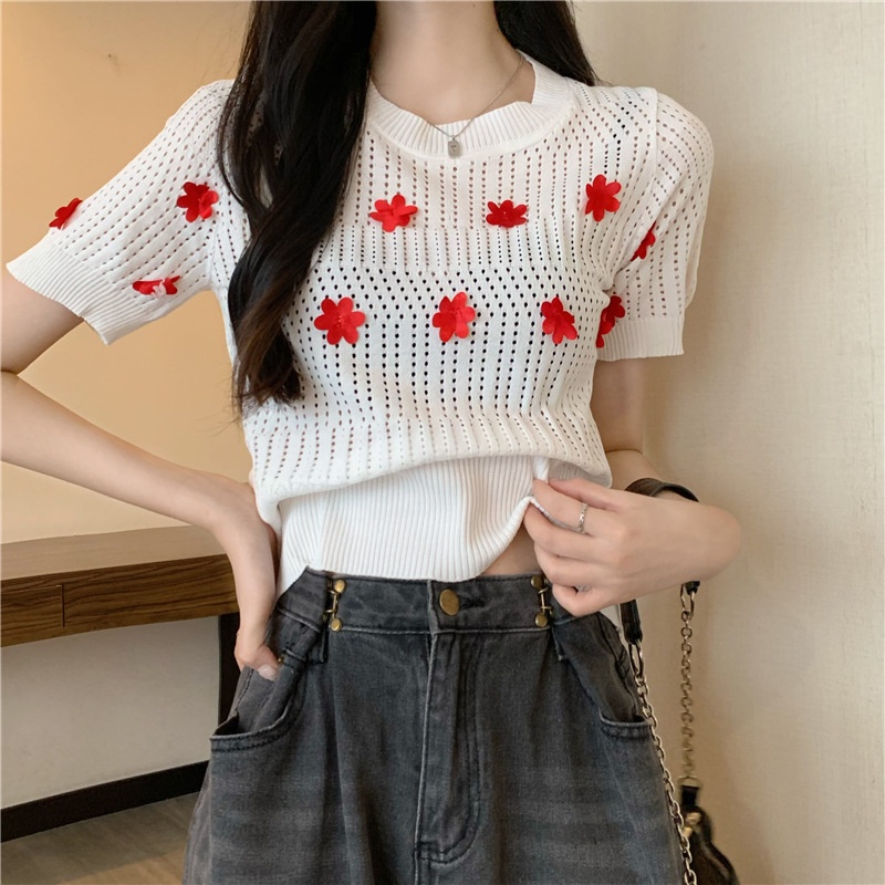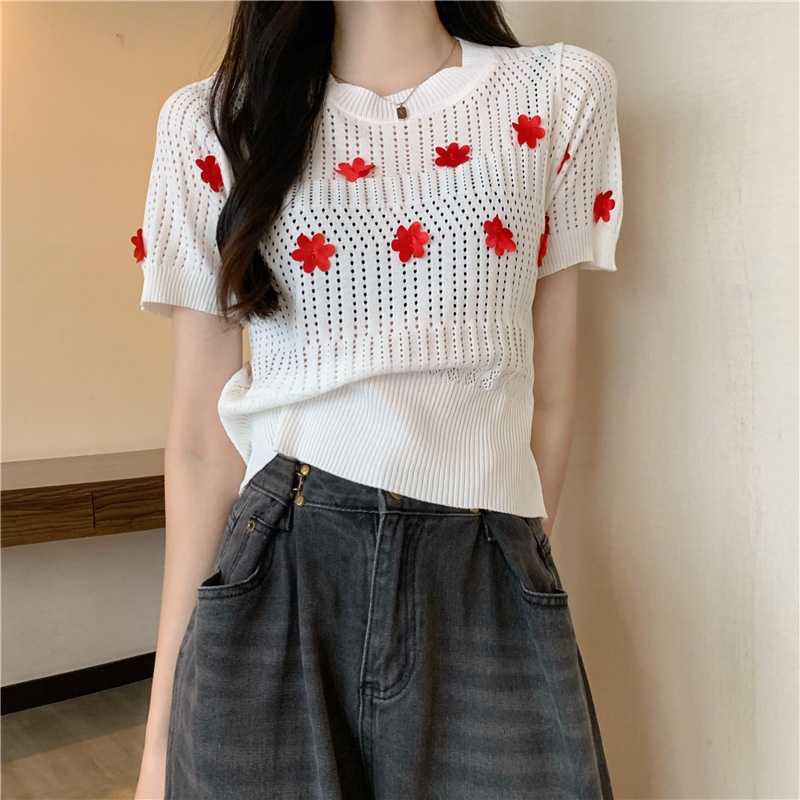 冰丝镂空高级感立体花朵针织衫套头圆领小香风短款短袖t恤上衣女