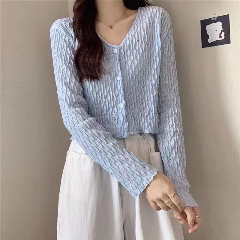 V领木耳边针织防晒小开衫女夏小个子薄款菱格镂空薄款外套空调衫