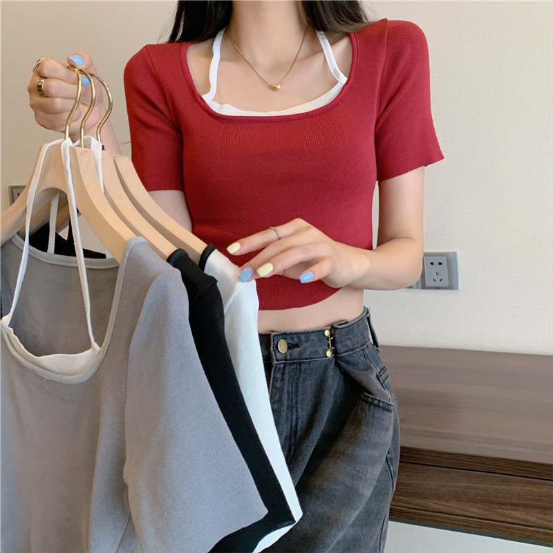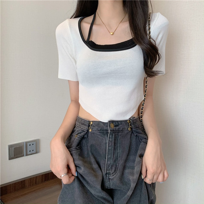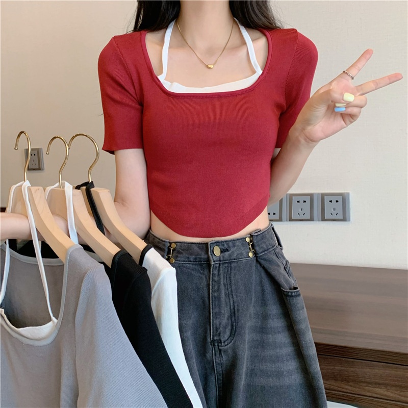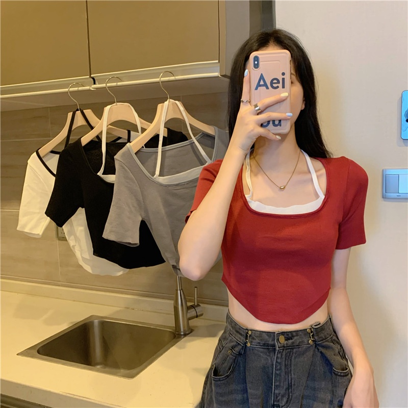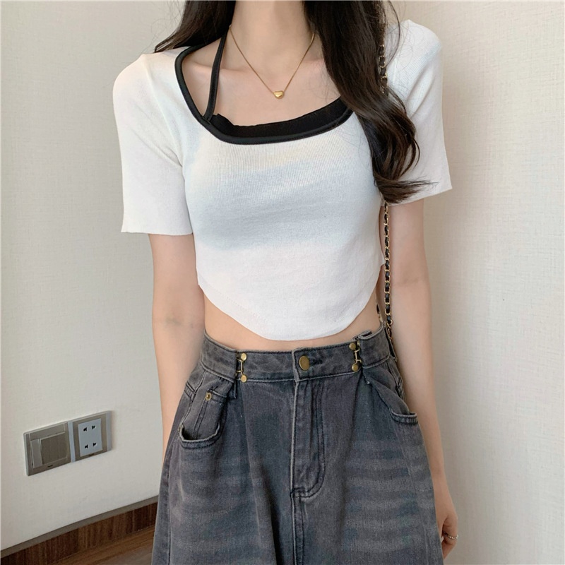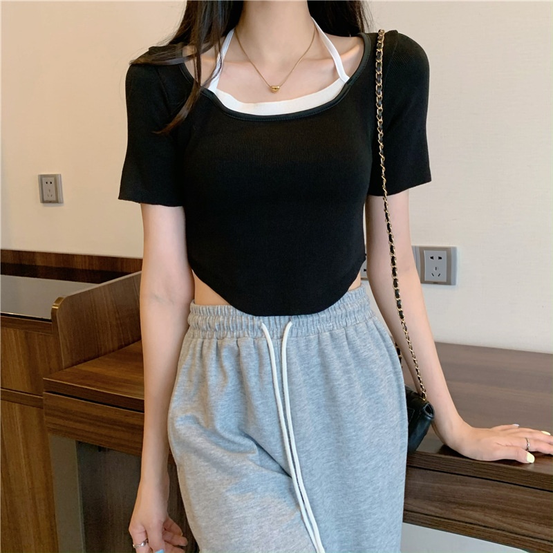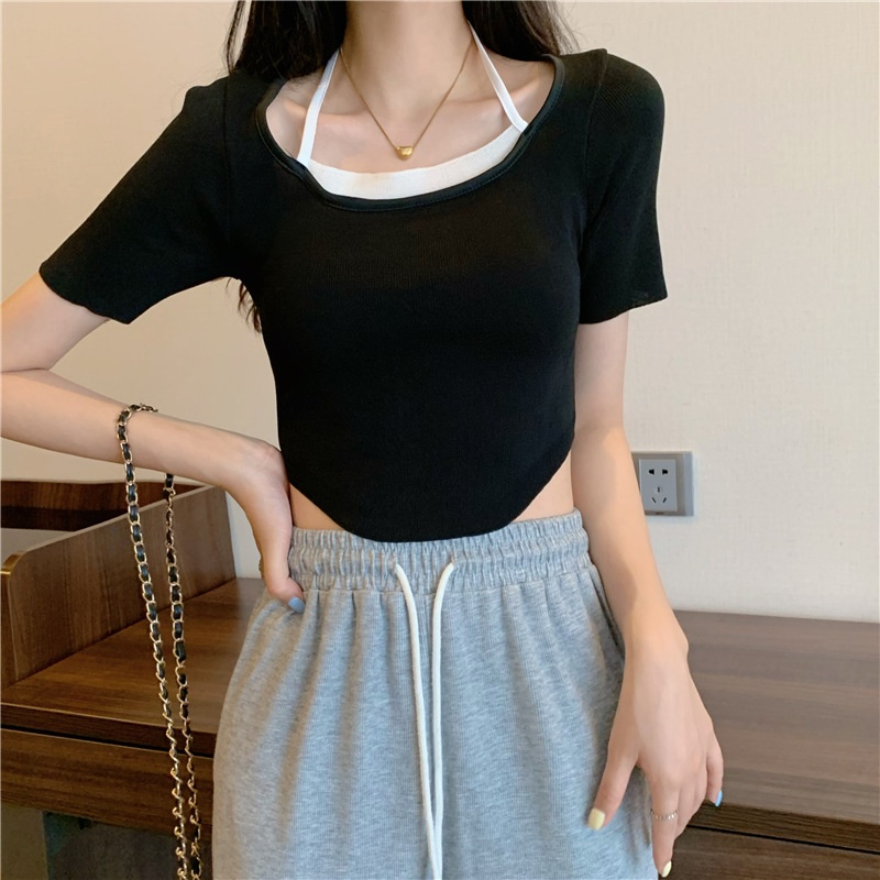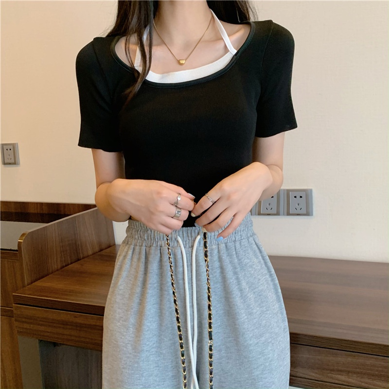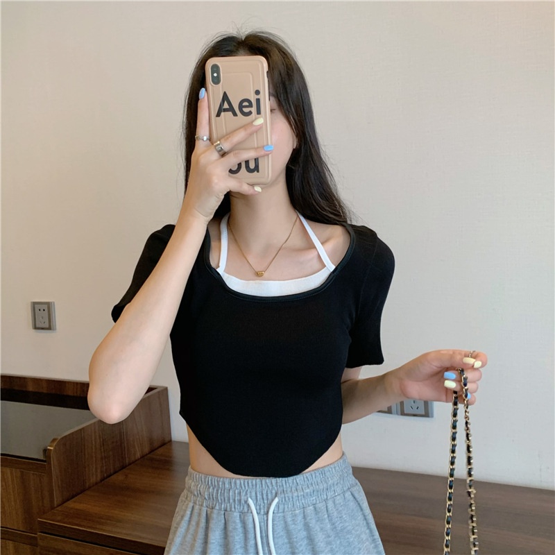 拼接挂脖不规则假两件t恤女小心机露锁骨修身显瘦短款短袖上衣女