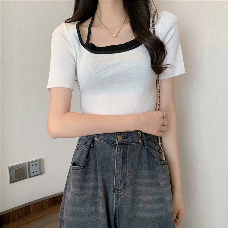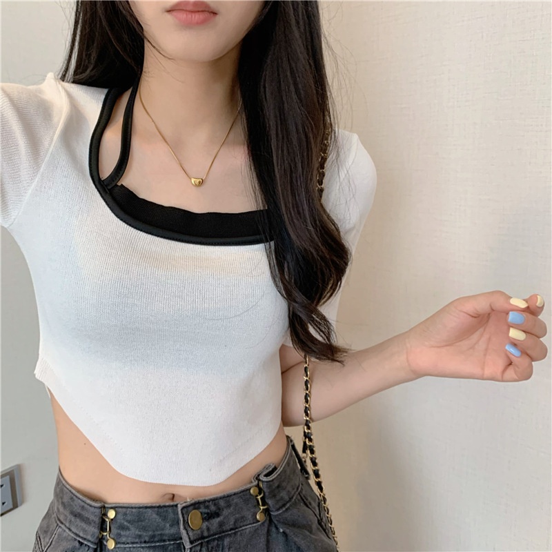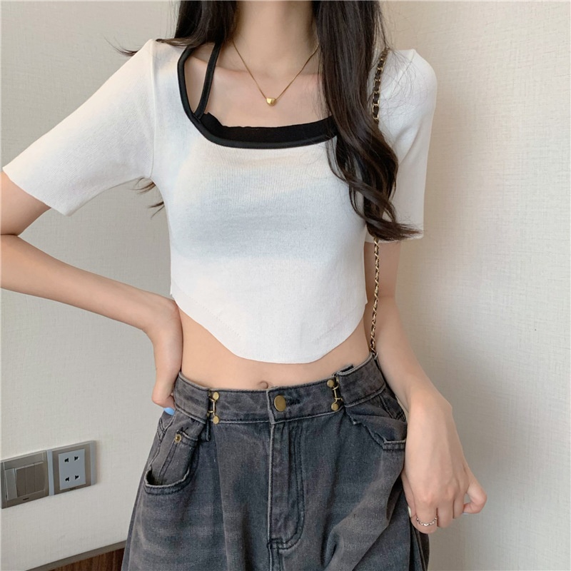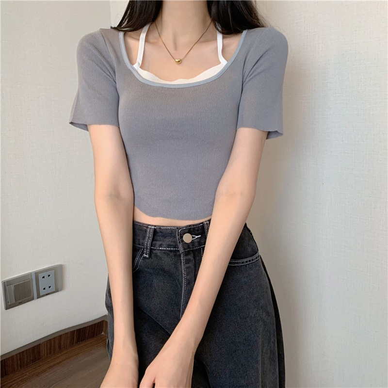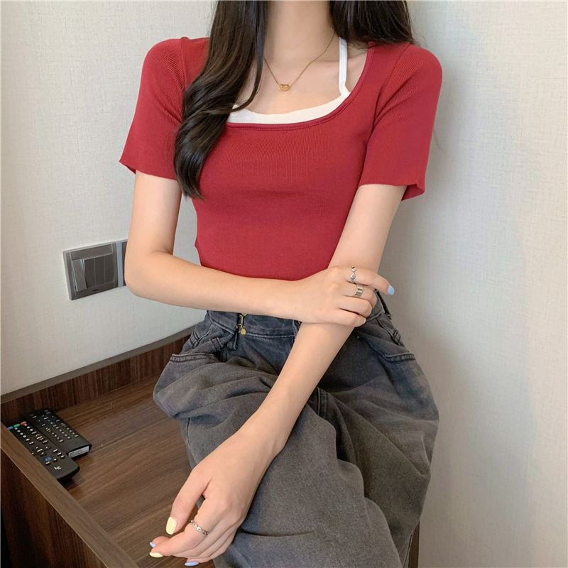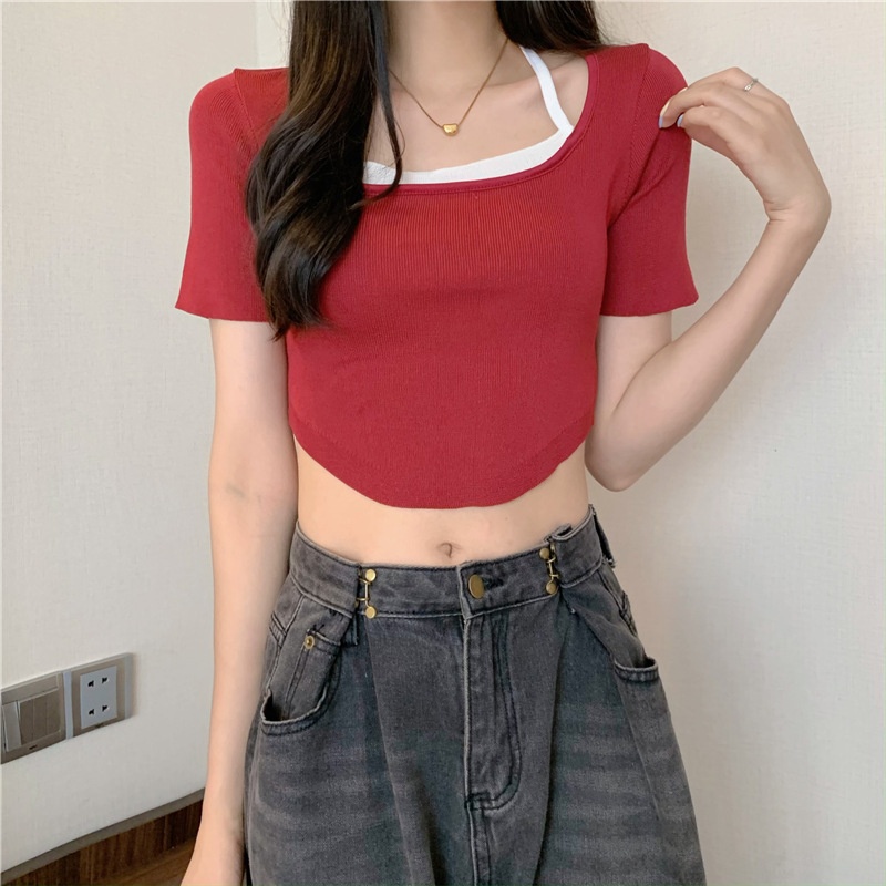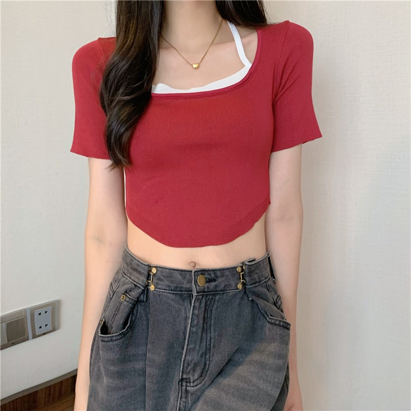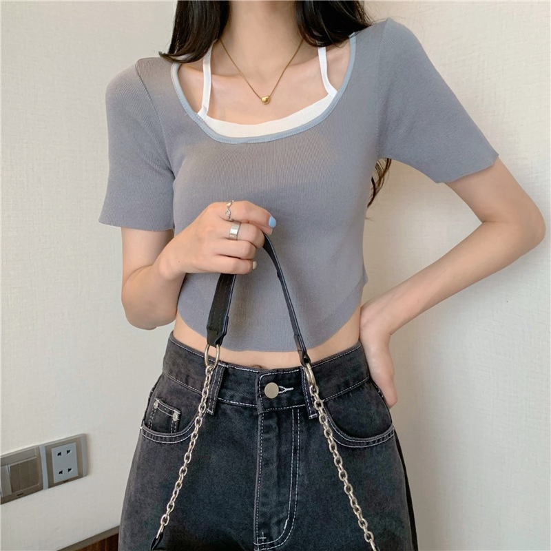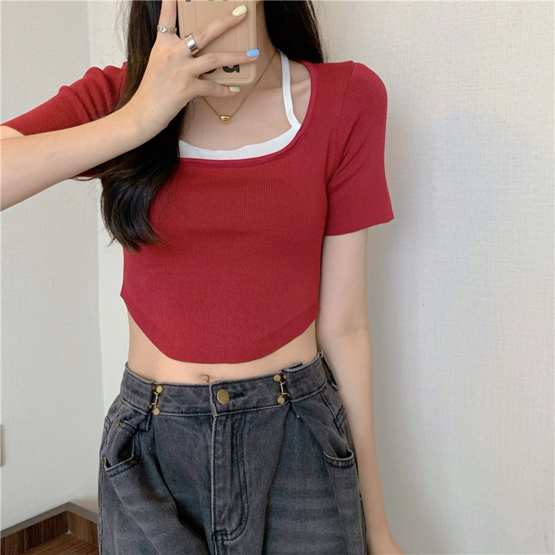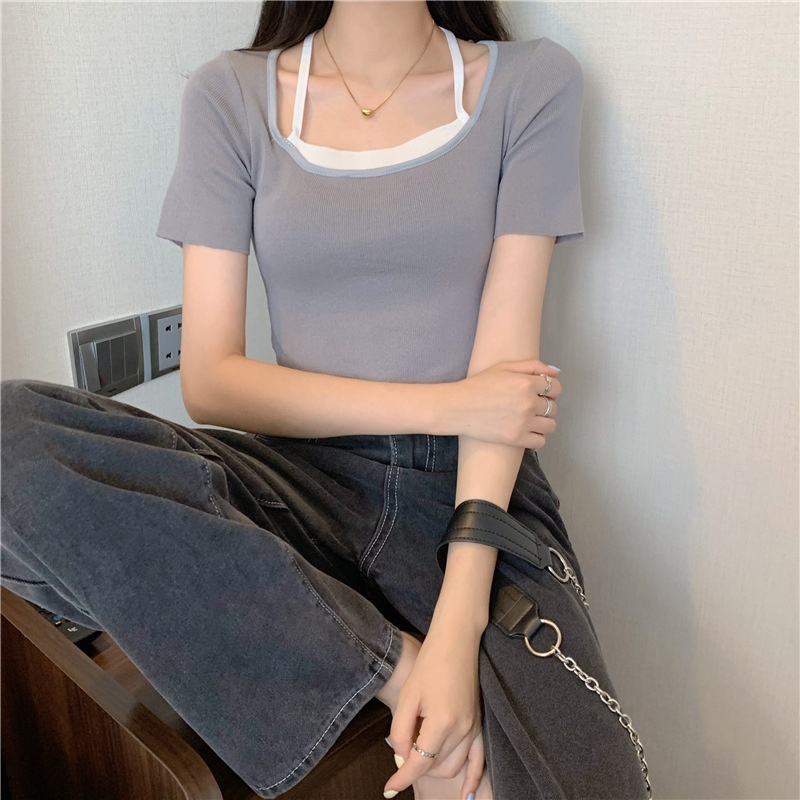 拼接挂脖不规则假两件t恤女小心机露锁骨修身显瘦短款短袖上衣女
