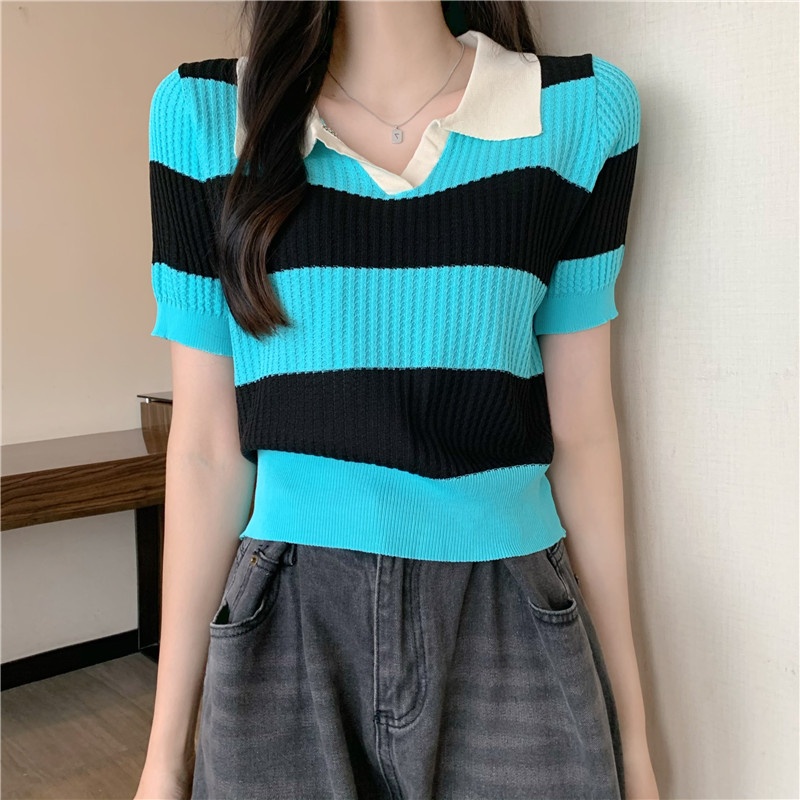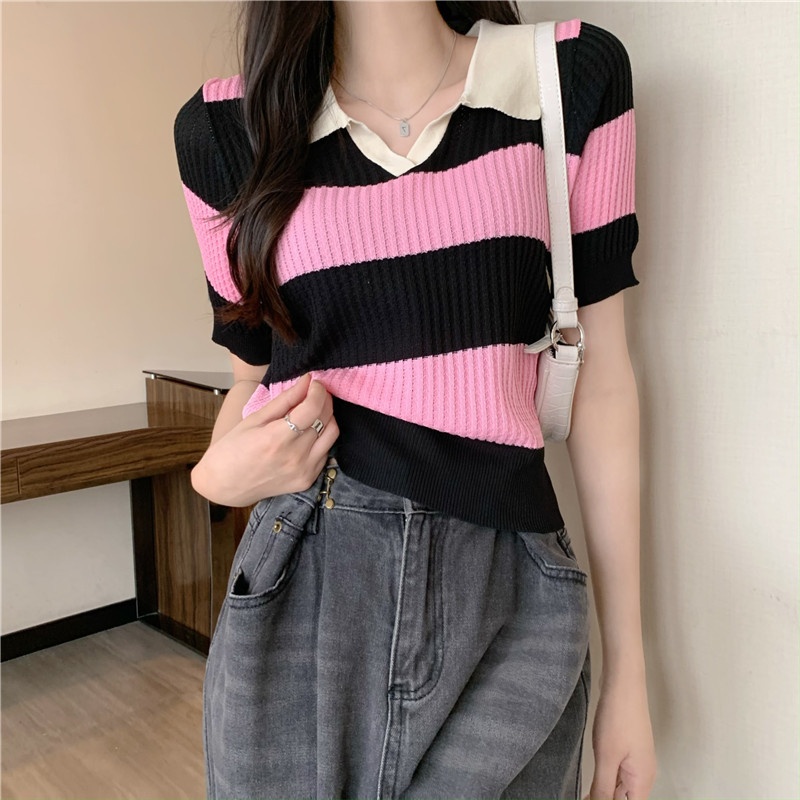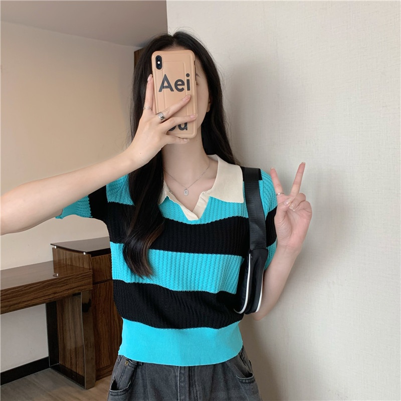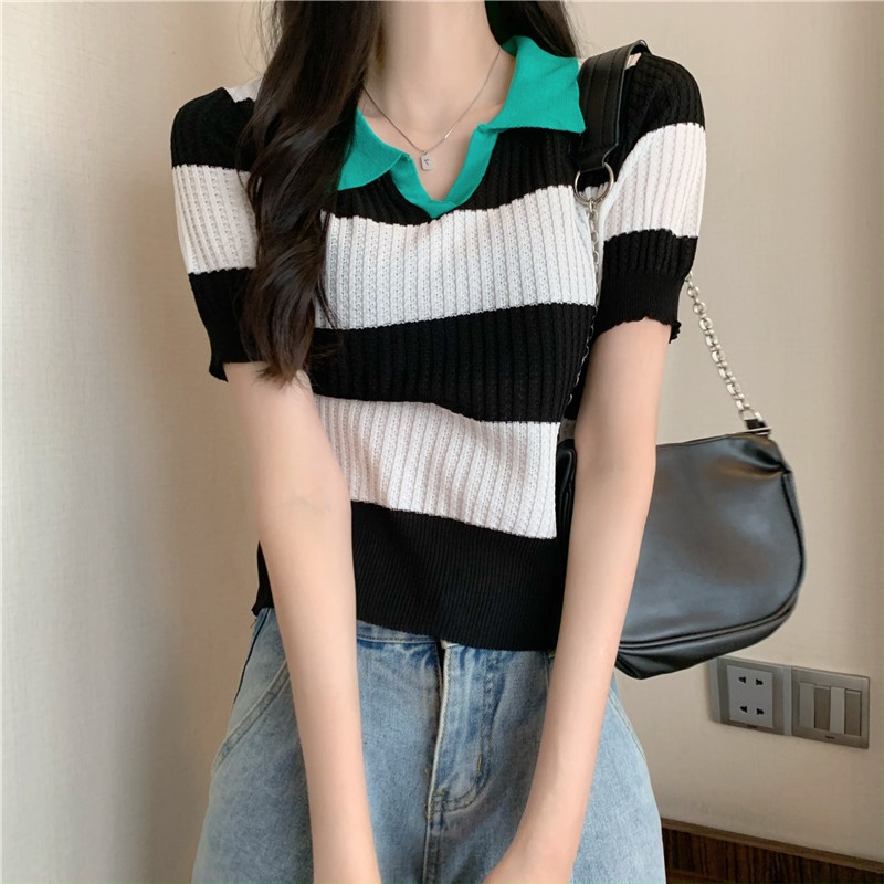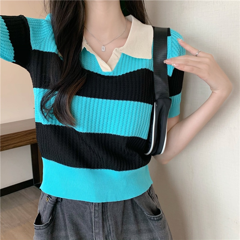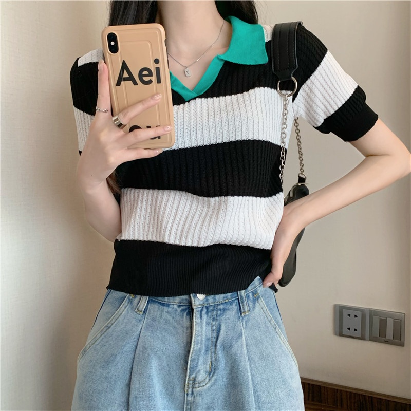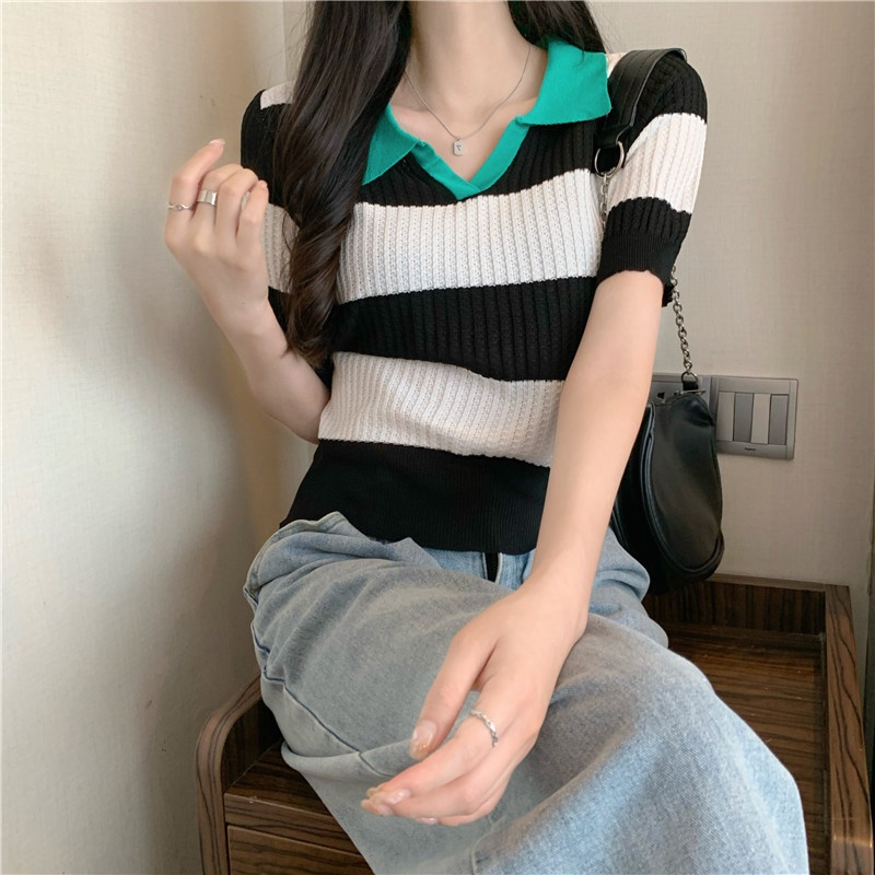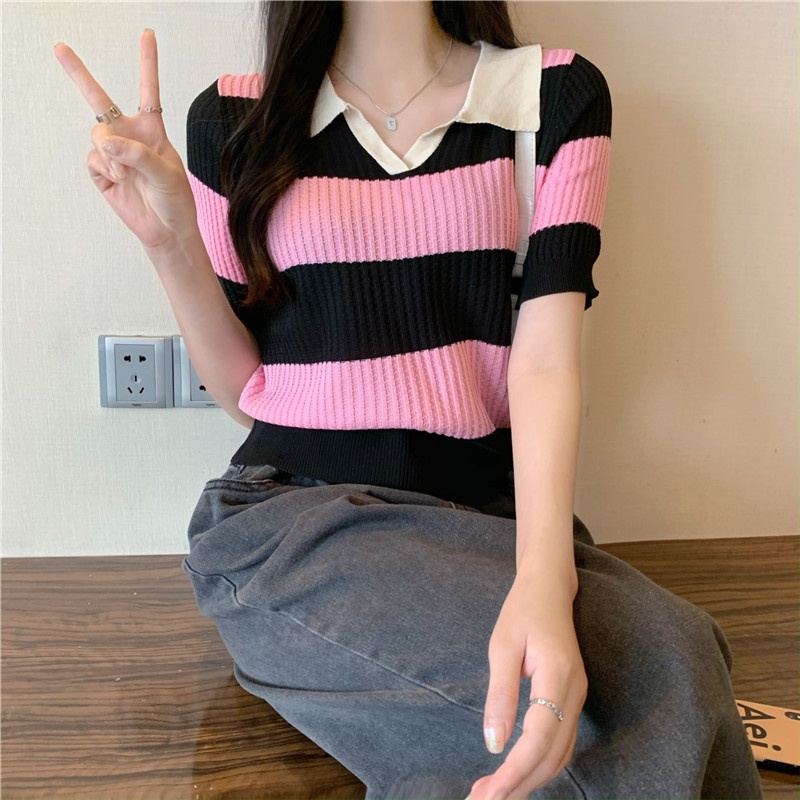 撞色polo领条纹针织衫女夏季设计感法法式复古薄款外穿短袖上衣女