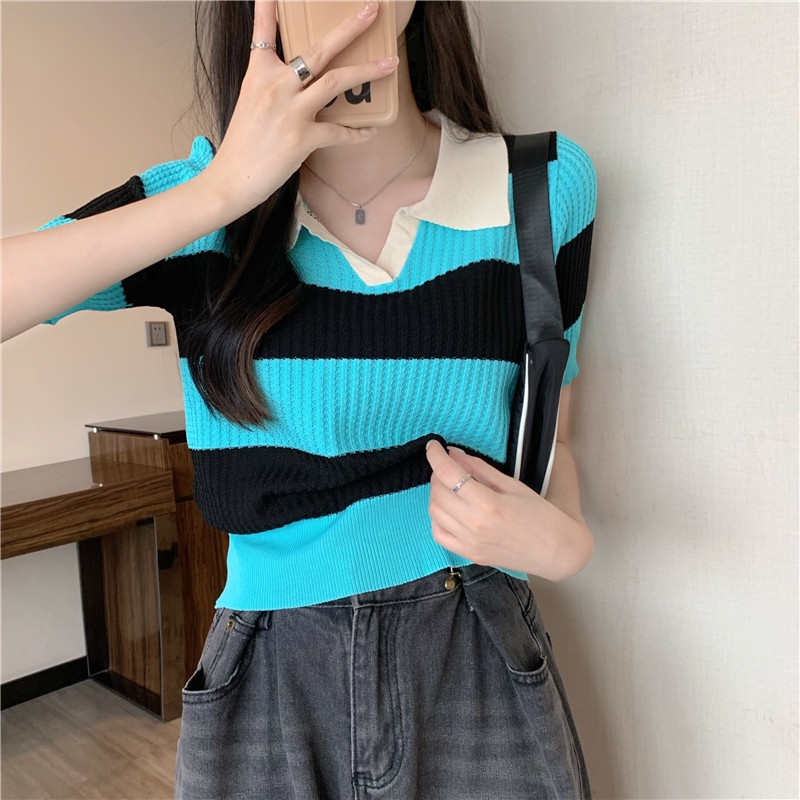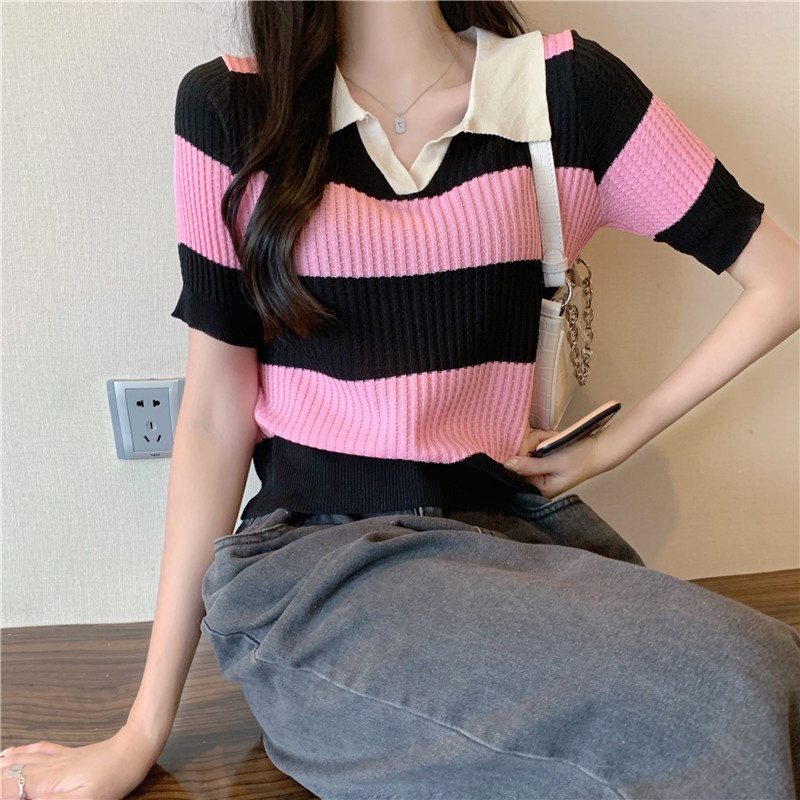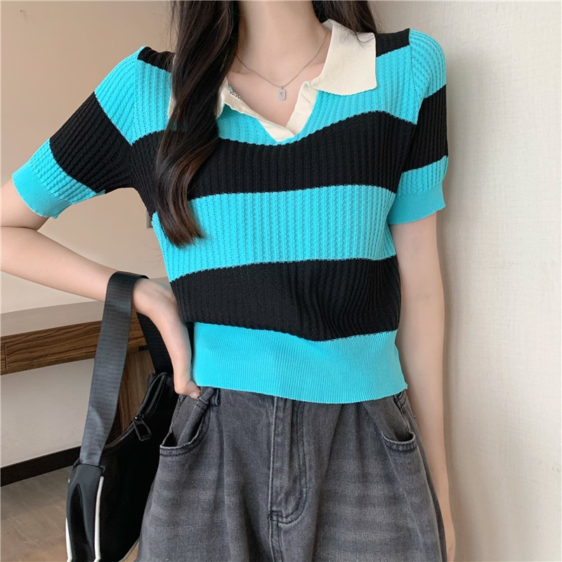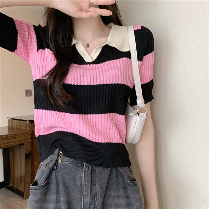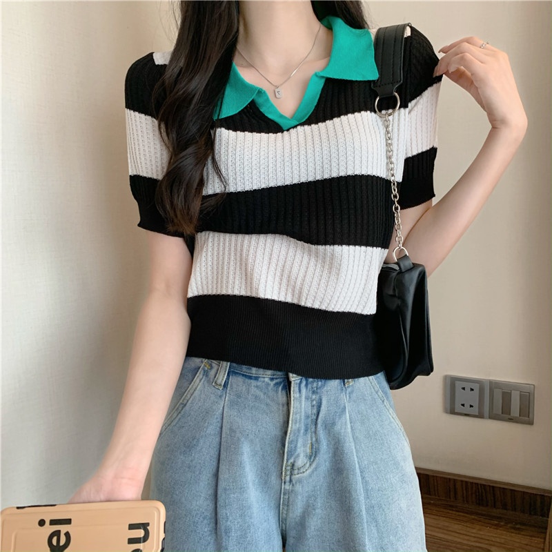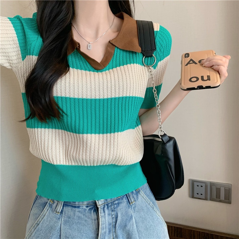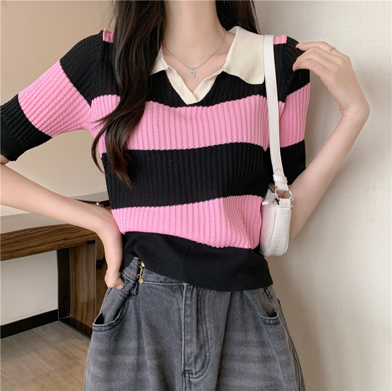 撞色polo领条纹针织衫女夏季设计感法法式复古薄款外穿短袖上衣女