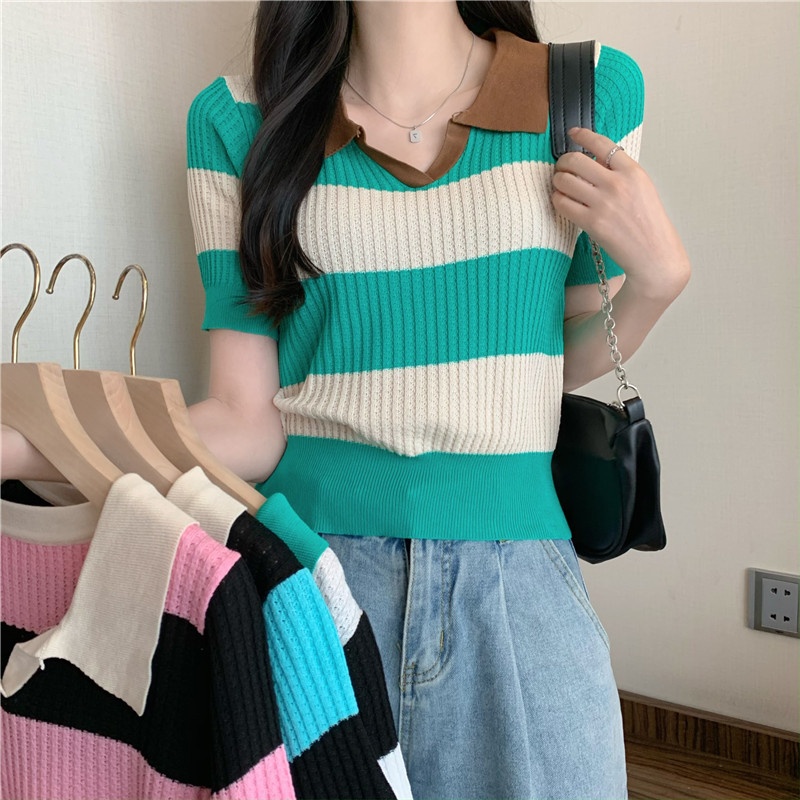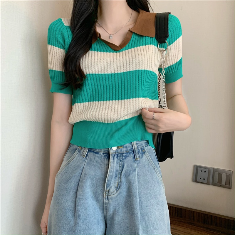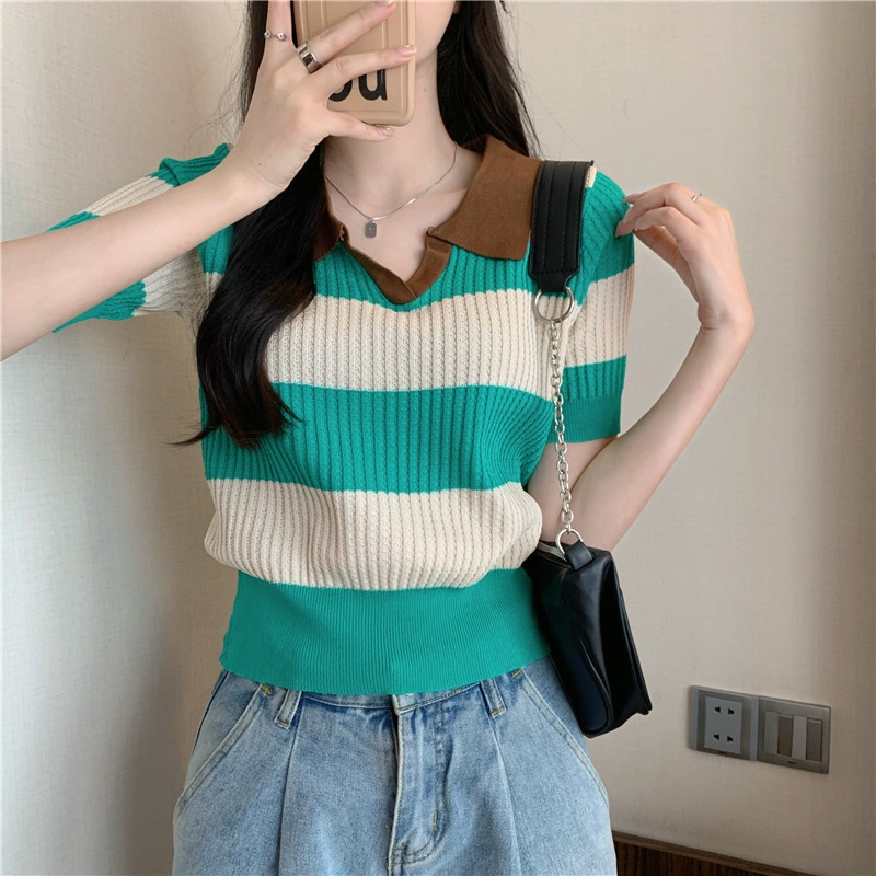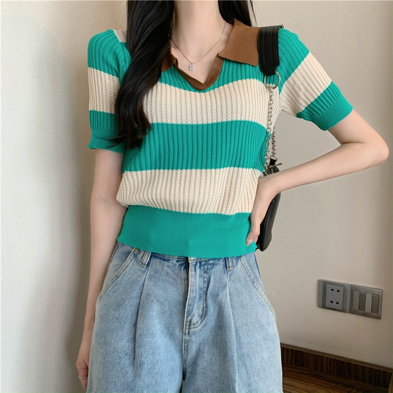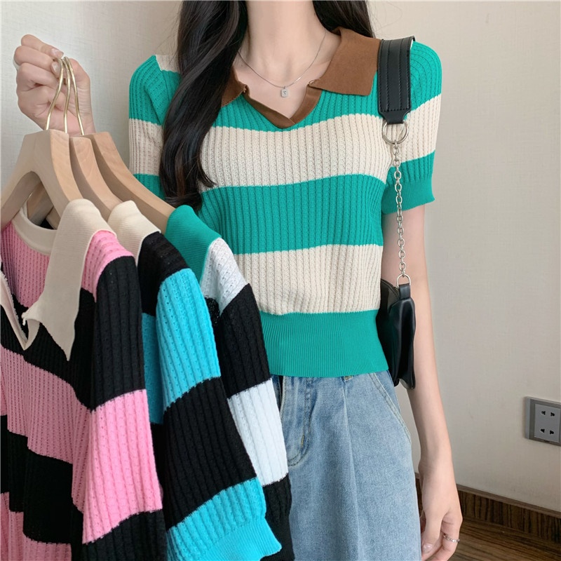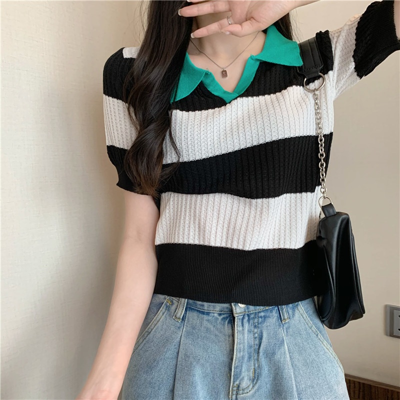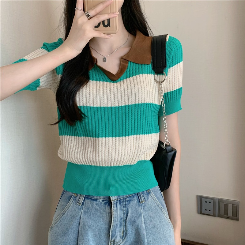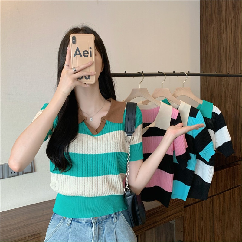撞色polo领条纹针织衫女夏季设计感法法式复古薄款外穿短袖上衣女